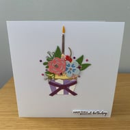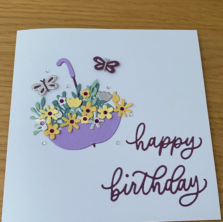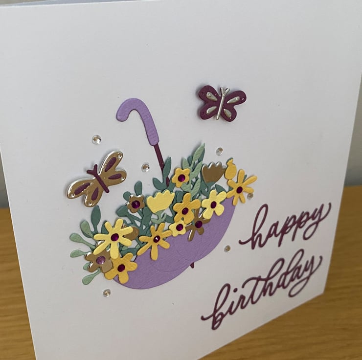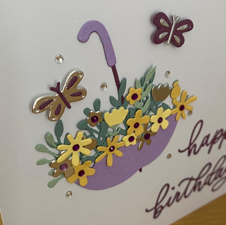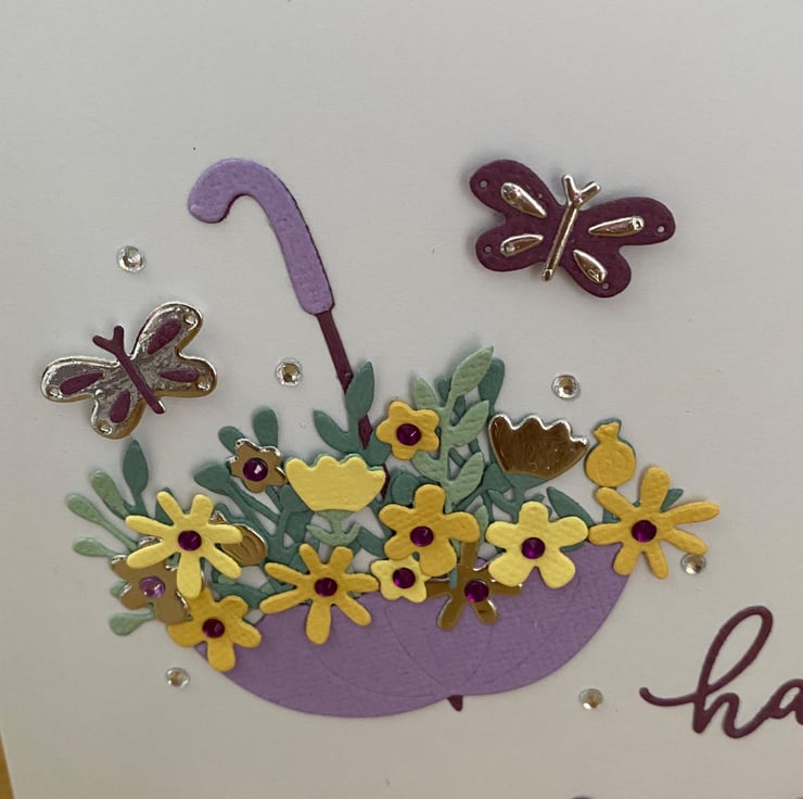 Bright, cheerful, and full of colour this birthday card features a purple umbrella overflowing with pretty blooms, finished with butterflies and tiny gem details.