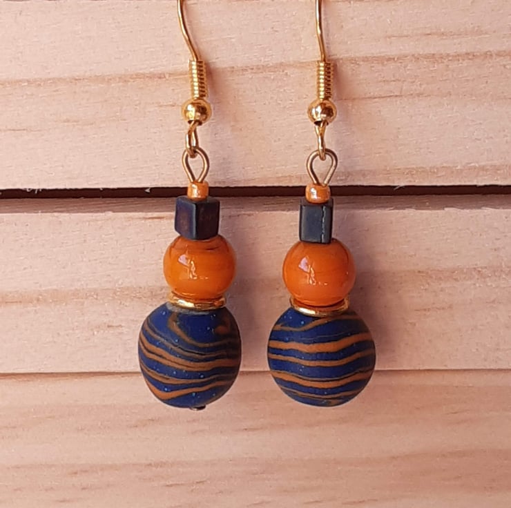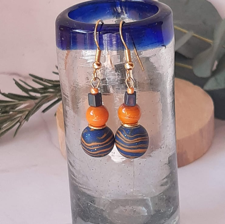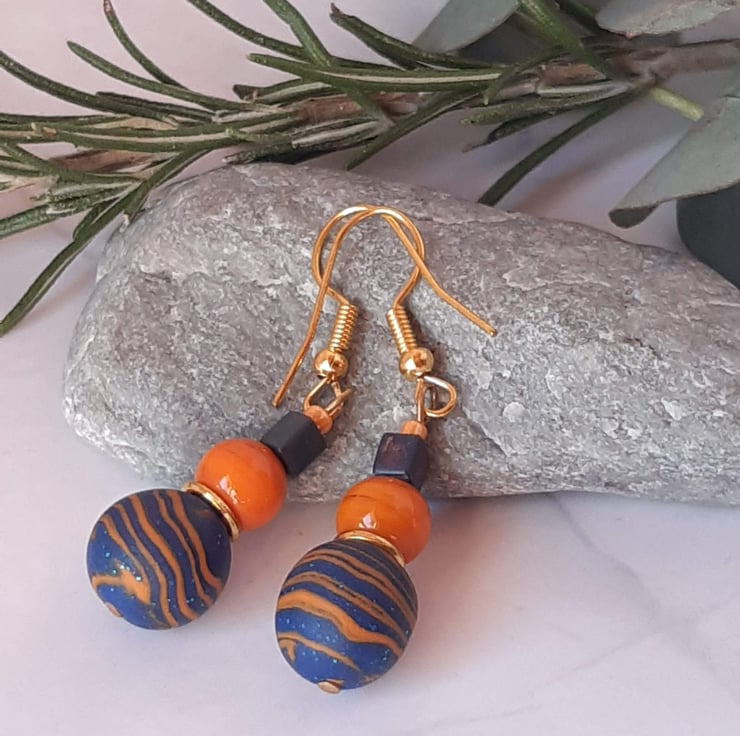 Handmade dangly earrings featuring orange and royal blue polymer clay in a unique swirl design with a hint of sparkle.
