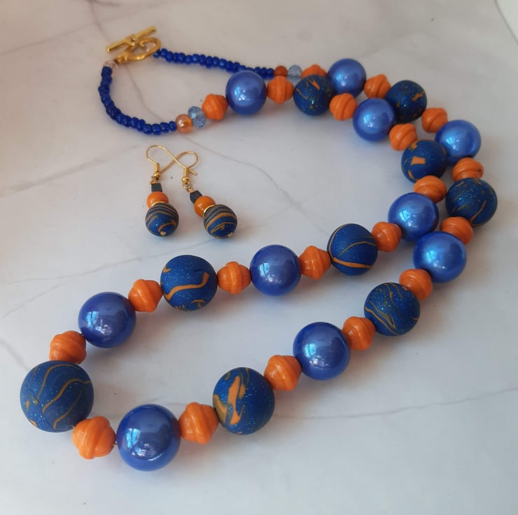 These earrings complement the orange and royal blue longer length necklace available in my shop.