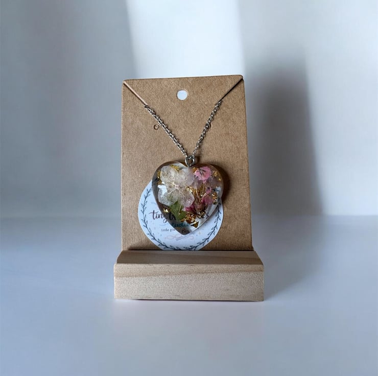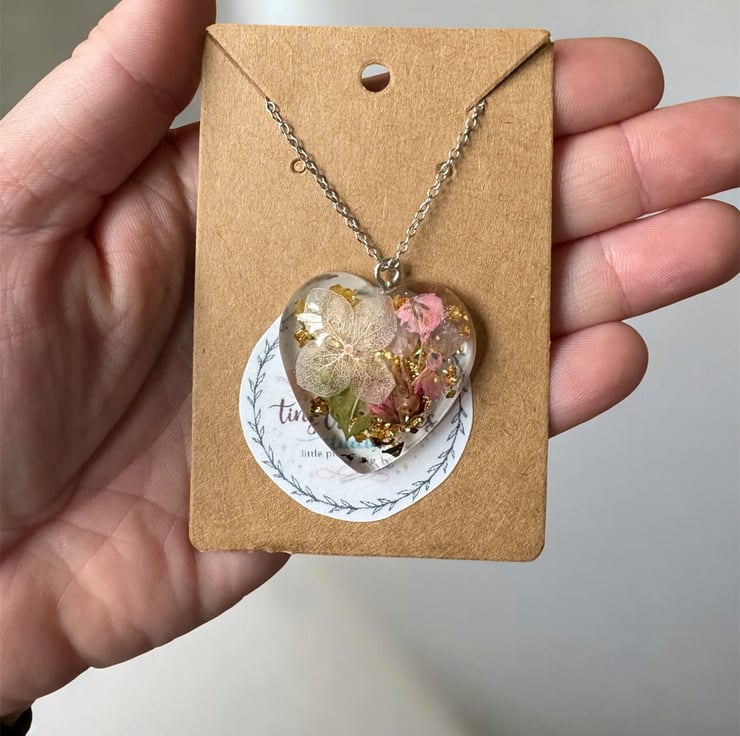 This handmade resin heart necklace captures the delicate beauty of real dried flowers, carefully preserved forever in a timeless keepsake