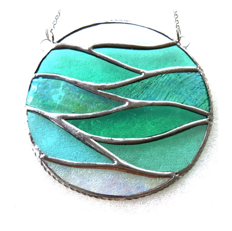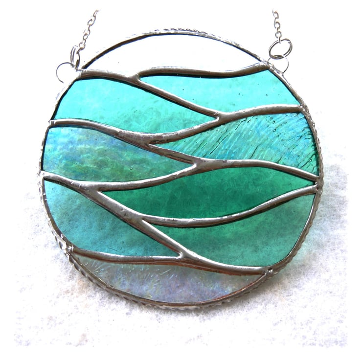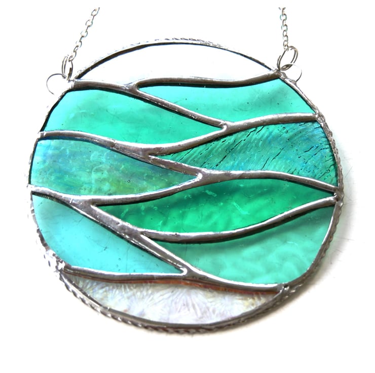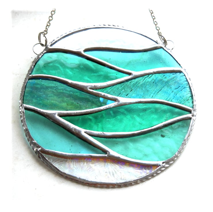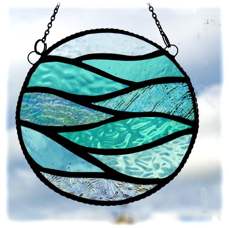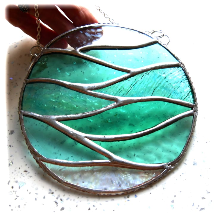 I've formed the waves into a circle and used lots of types of gorgeous shades and textures of teal coloured glass. The bottom wave is iridised crystal clear to depict the waves breaking on the shoreline.