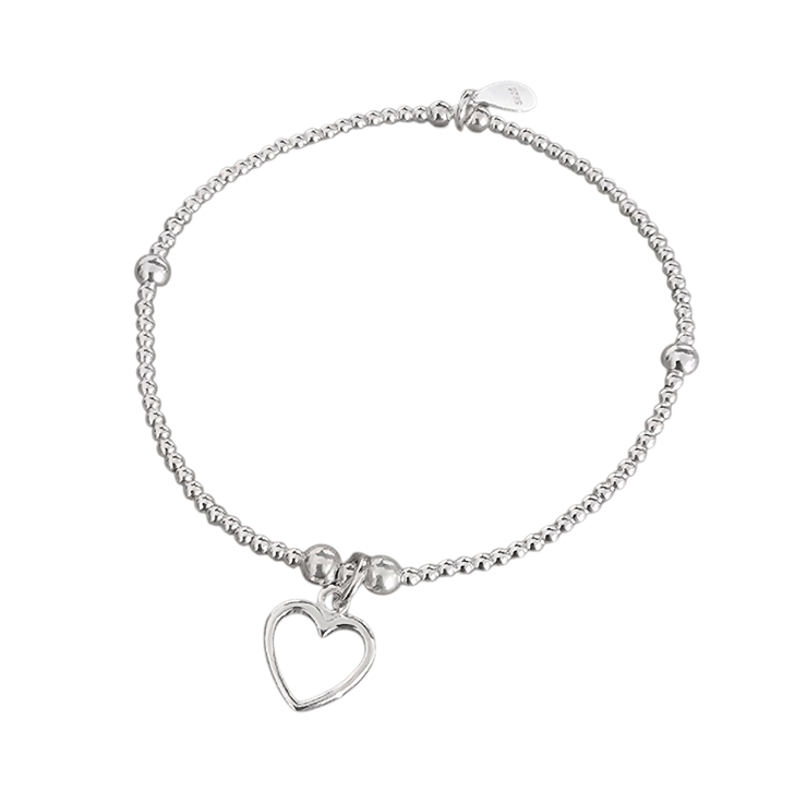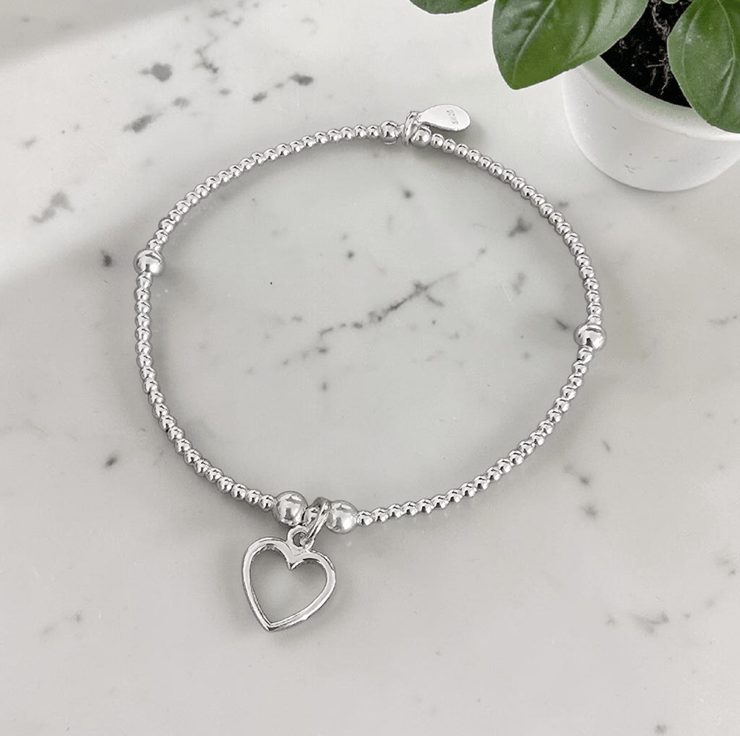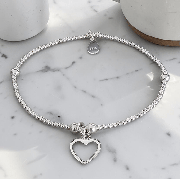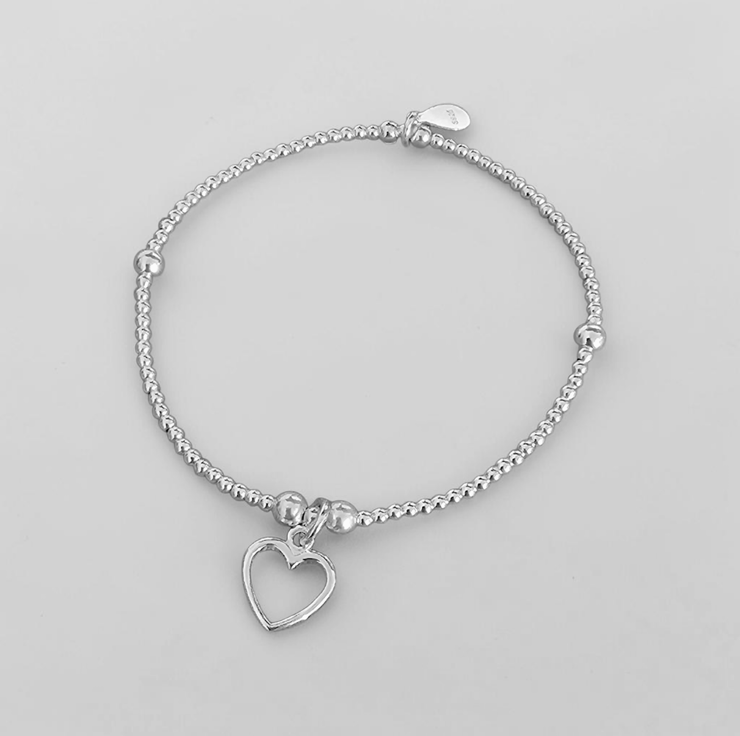 Dainty Sterling silver open heart charm stretch bracelet. Beautifully designed and and a wonderful bracelet to own. Perfect for any jewellery collection.