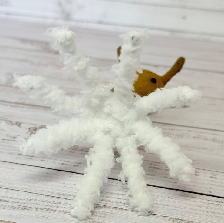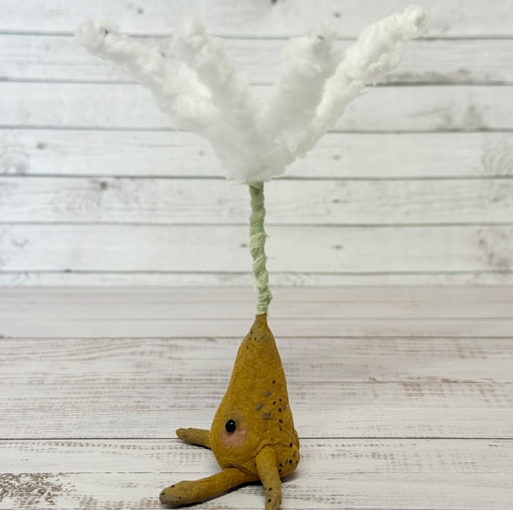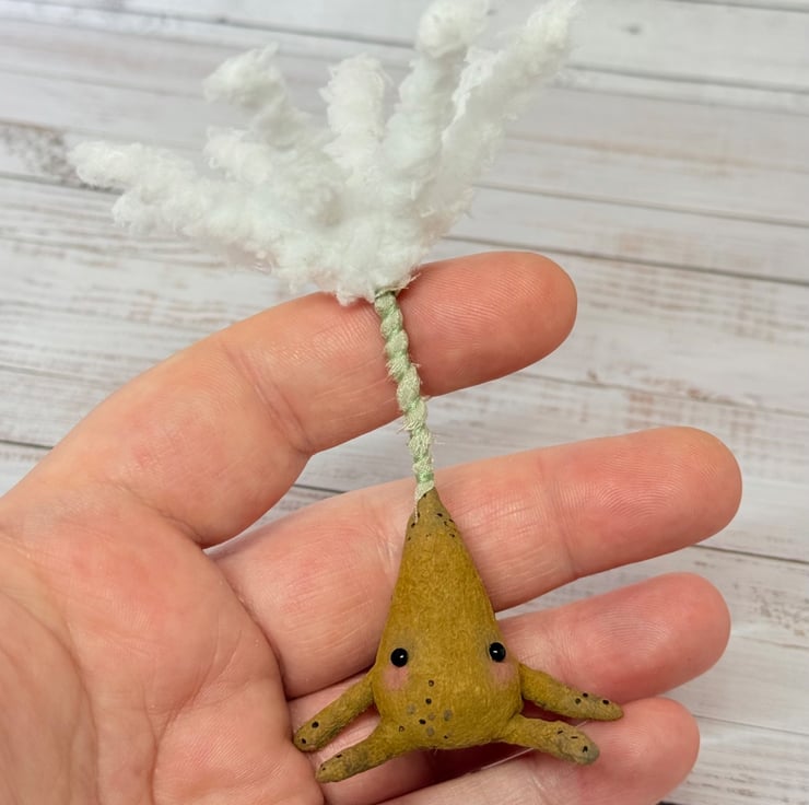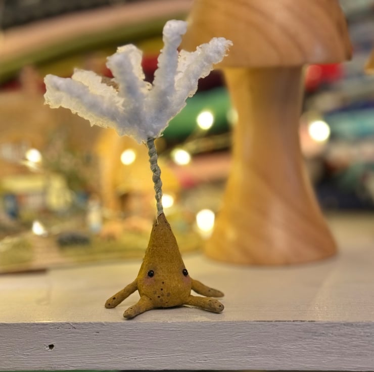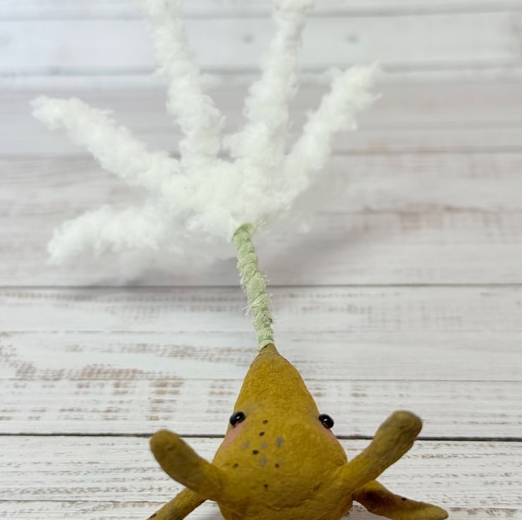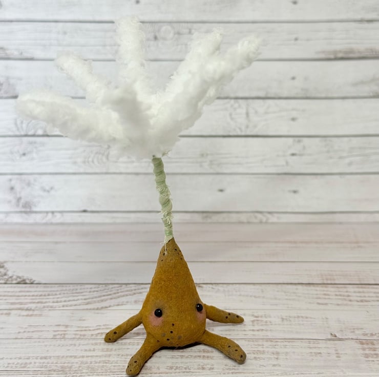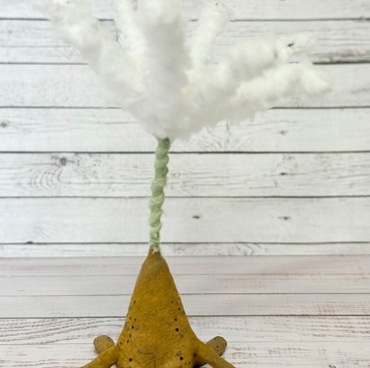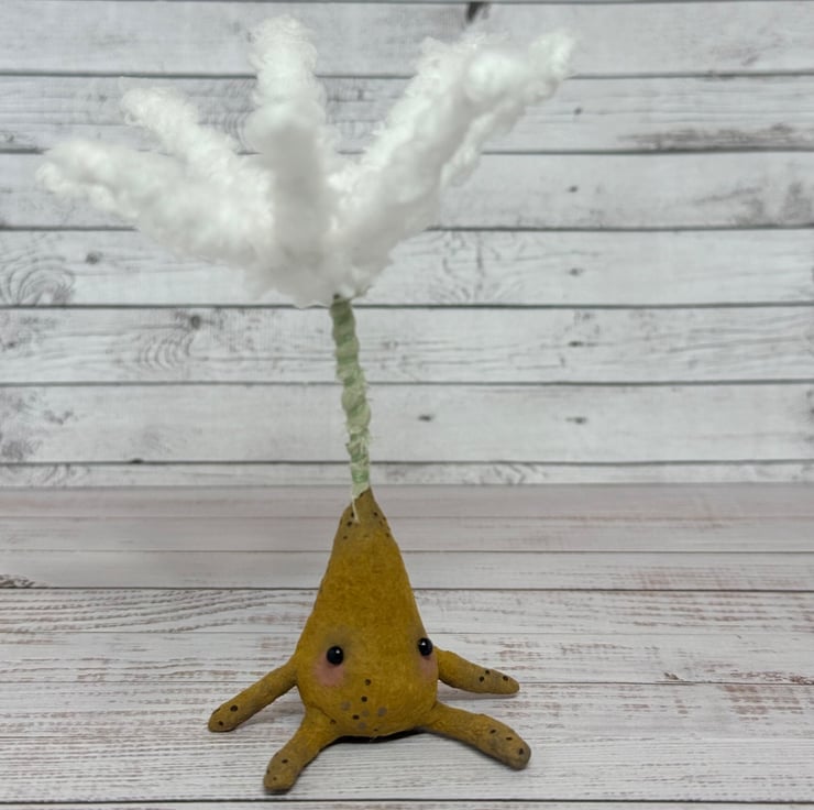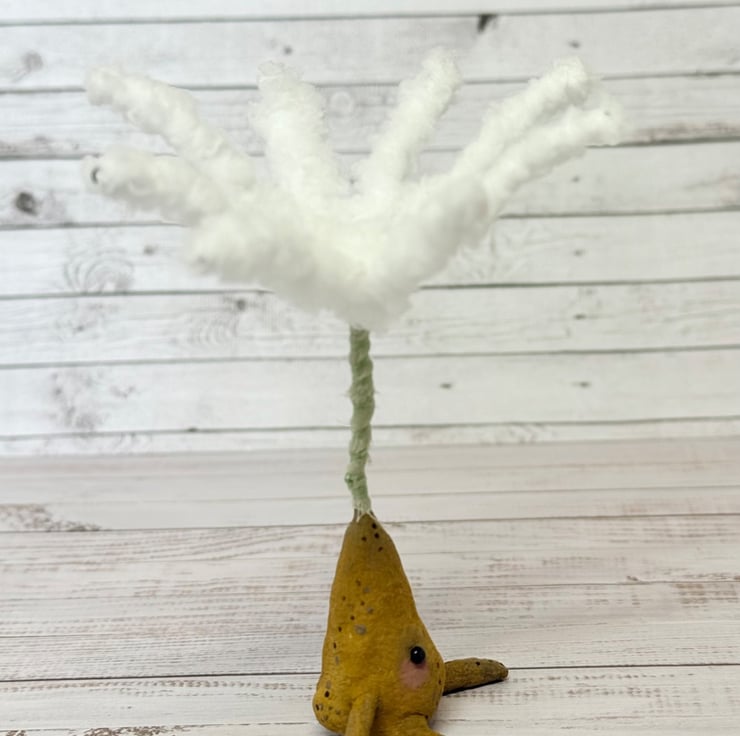 Made from spun cotton with internal wire frame. The dandelion seed sits unaided and has a thread and chiffon covered wire stem. The top of the seed is covered in fluffy yarn and seed measures roughly 10cm tall. The seed is completely hand painted and has glass bead eyes. This is for decorative purposes only and is not a toy. Beautifully gift wrapped and sent in recyclable or recycled packaging.