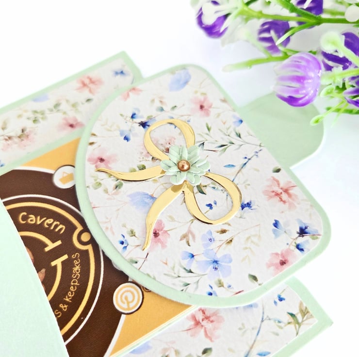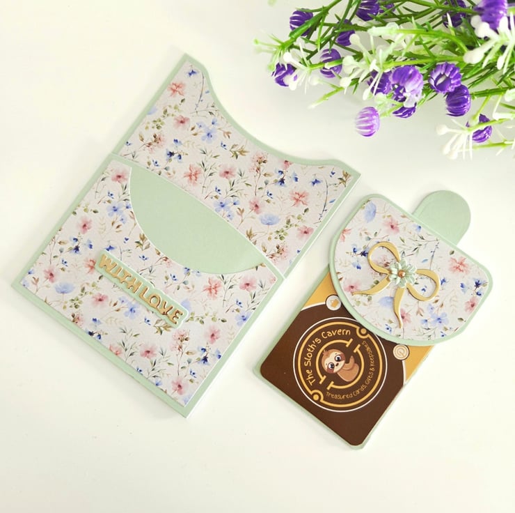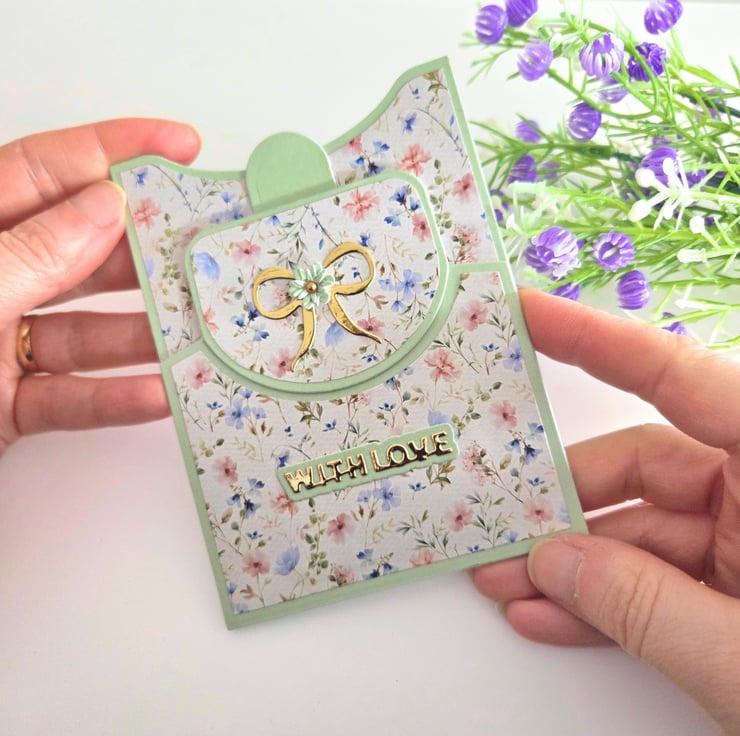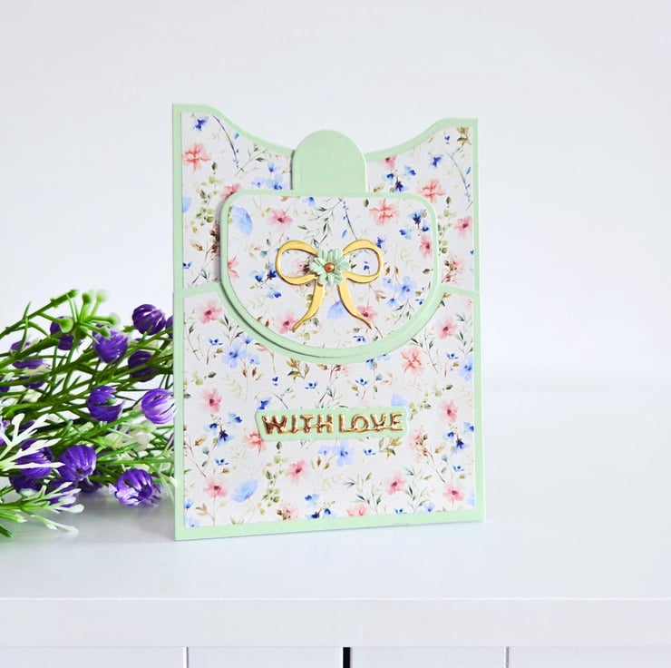 The main wallet is made cardstock in pastel mint green, decorated with quality, floral patterned paper. The rounded pocket flap that slides in & out the pocket is similarly decorated and will keep the gift card safe inside the wallet. It is embellished on the top with a bow made of gold mirror card and a paper flower with a small gold pearl in the centre. The sentiment "With Love" lies underneath, also cut-out of gold mirror card. The pocket is decorated on the front and the back, for a beautiful and with attention to detail finish!