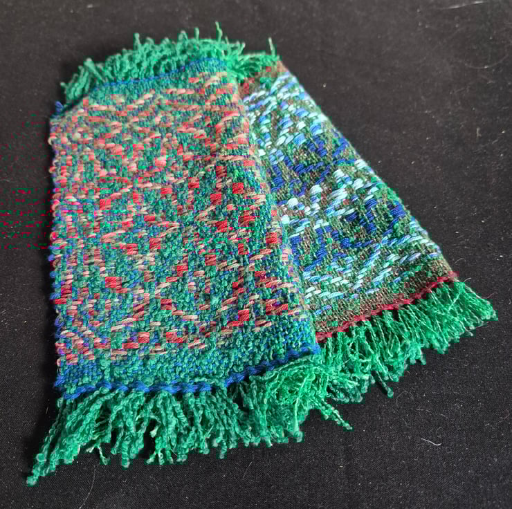 The warp is in a green synthetic boucle yarn . The warp is in a variety of colours in cotton yarn.