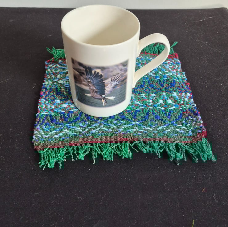 A pair of mug mats. In a mix of cotton and synthetic boucle yarn.