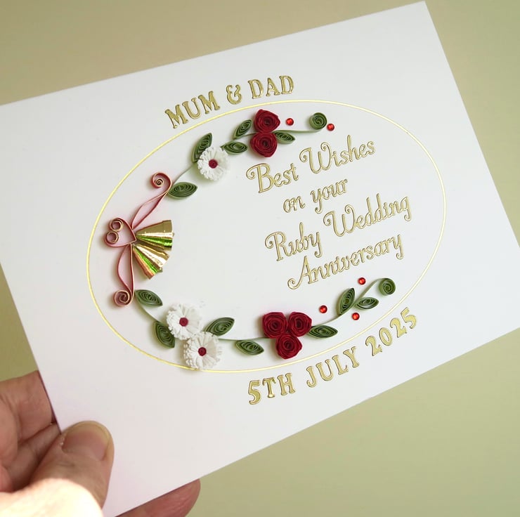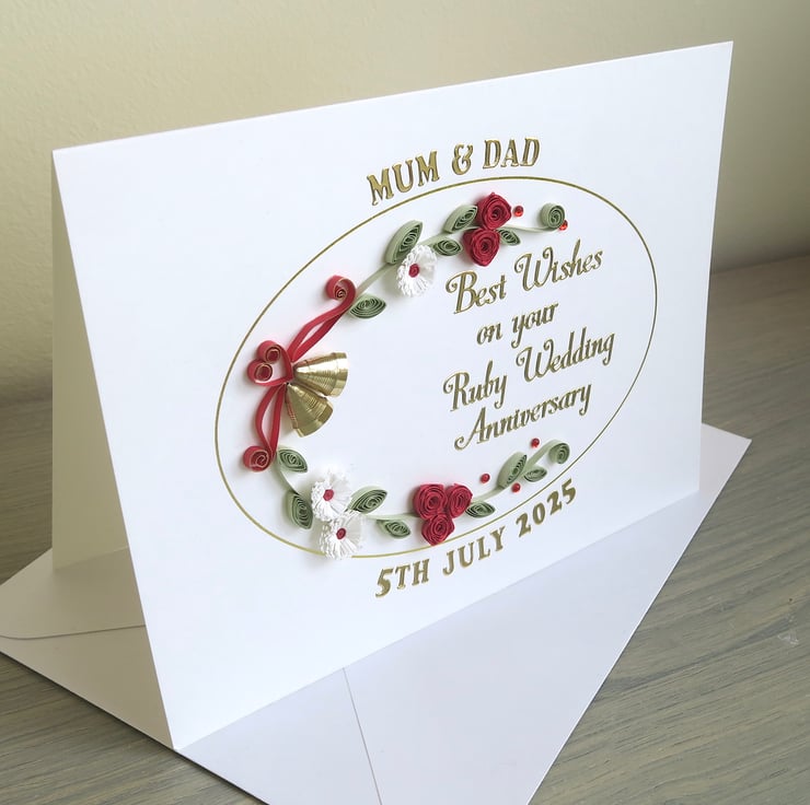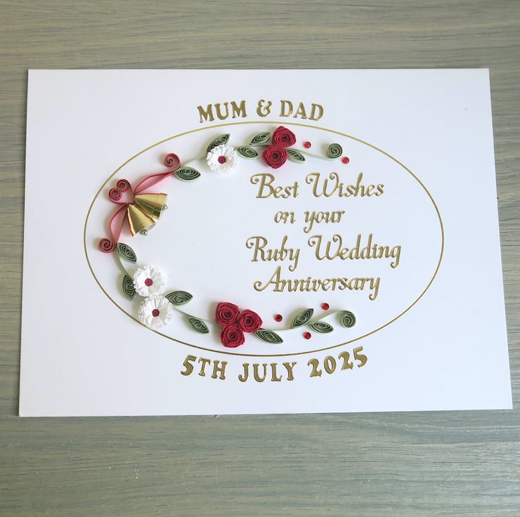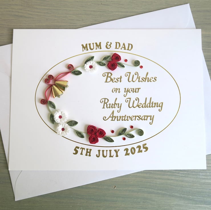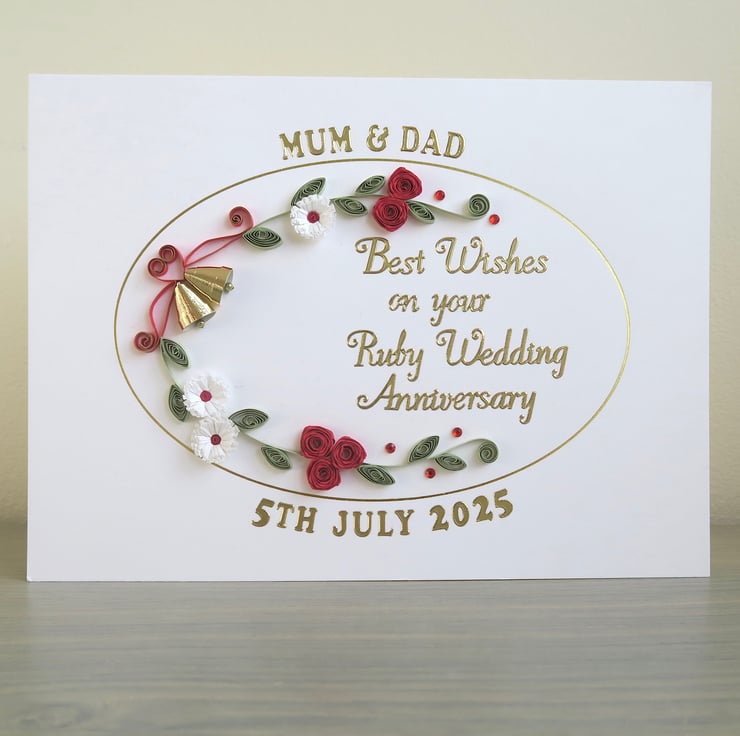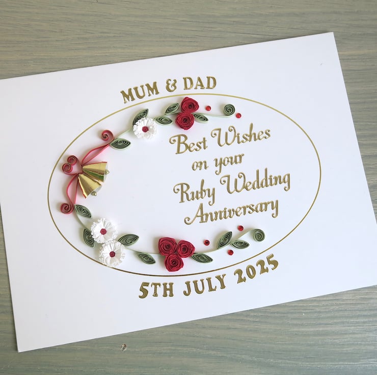 A beautiful handmade quilled 40th ruby anniversary card with quilling roses, daisies and bells. Perfect for helping a special couple celebrate a milestone anniversary.