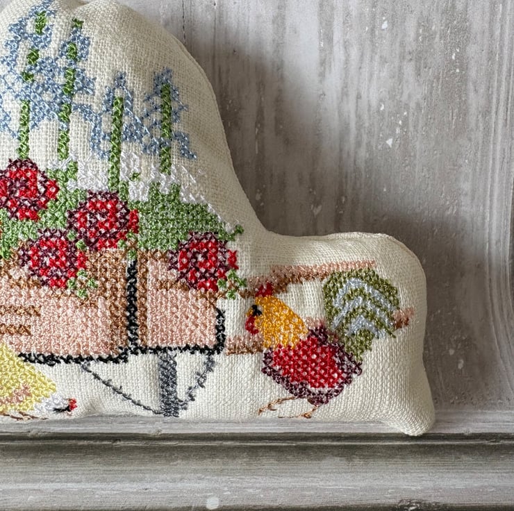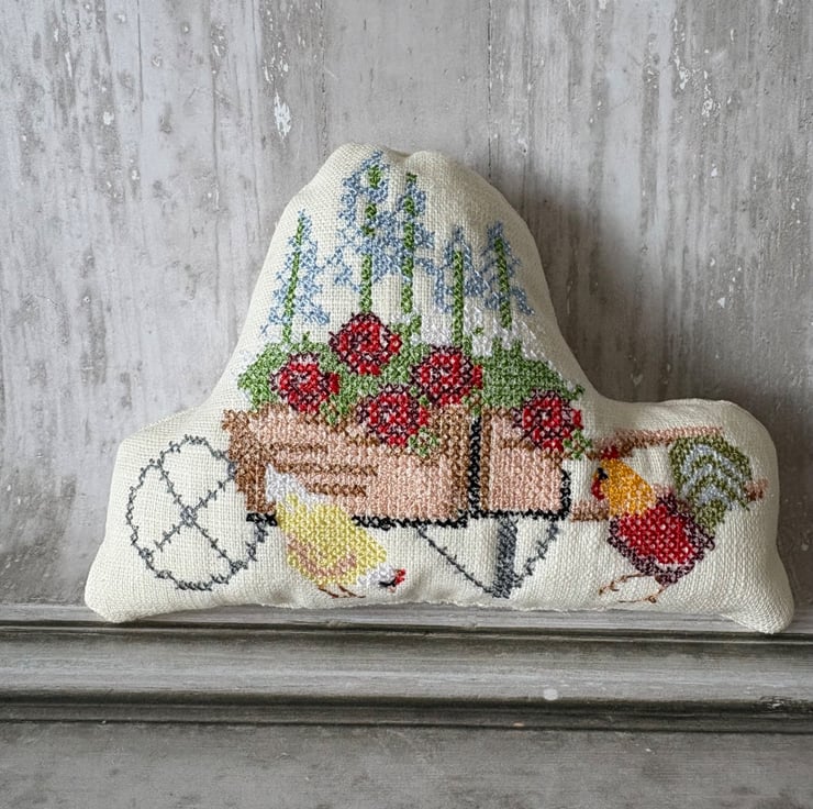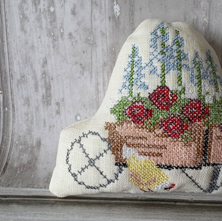 May is almost here and the end of Spring. This little pillow of joy has a wheelbarrow filled with flowers cross stitched by my embroidery machine. Made from perfectly pale prewashed linen, filled with polyester fibrefill. Buy one as a small gift or fill a bowl for the season. Measures 5" x 4"