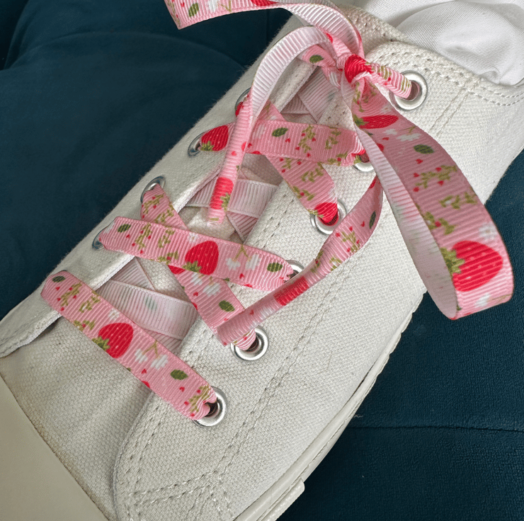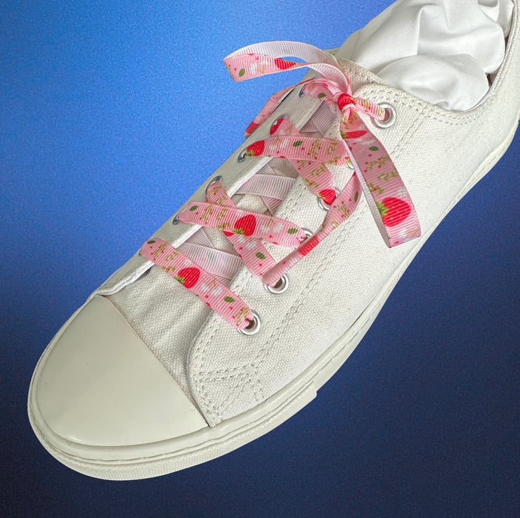 Give your shoes a little personality boost with these cute Strawberry ribbon shoelaces, handmade to add a fun, decorative twist to trainers, pumps and fashion footwear.