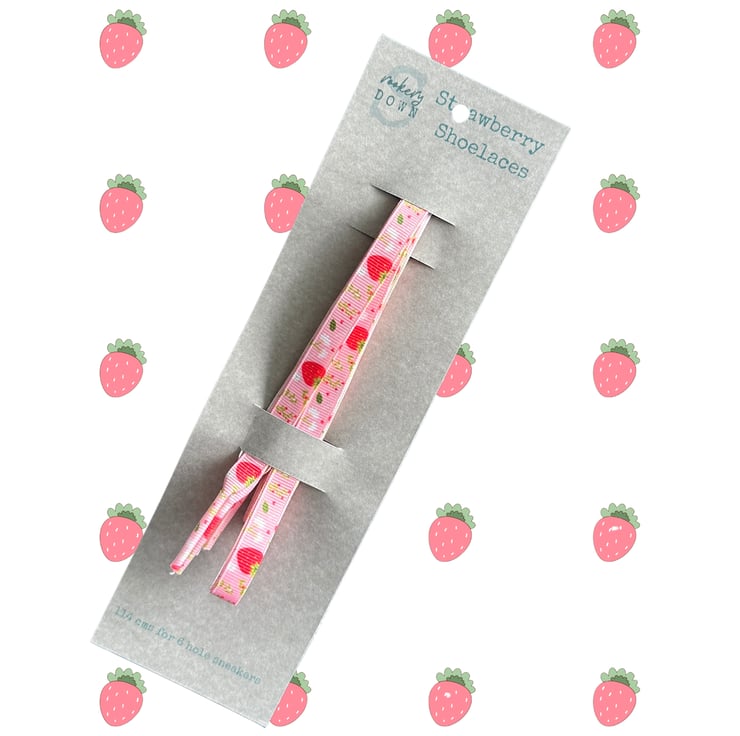 Each pair is made from soft, pink grosgrain ribbon, printed with strawberries and tiny flowers, carefully cut to length and finished with clear sealed ends to make threading easy and prevent fraying.