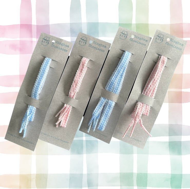 Each pair is made from soft, gingham ribbon with pretty picot edging, carefully cut to length and finished with clear sealed ends to make threading easy and prevent fraying.