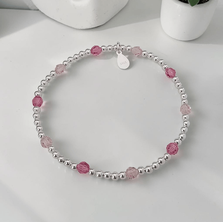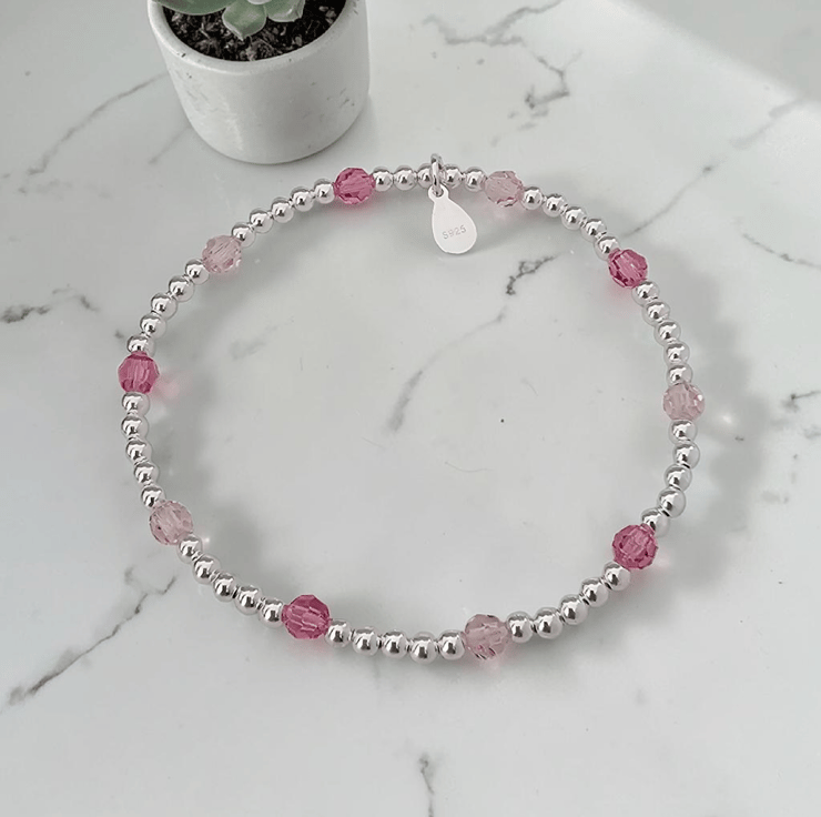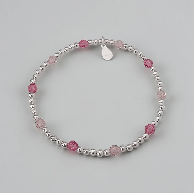Sterling Silver & Pink crystal stretch bracelet. Beautifully designed with sparkly mixed pink Preciosa beads and Sterling silver beads. Truly a lovely bracelet to own and one for your jewellery collection. Add a touch of pink. Jewellery is presented with our signature Silversoul Collection gift box & pouch.