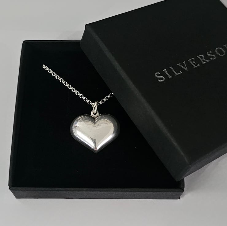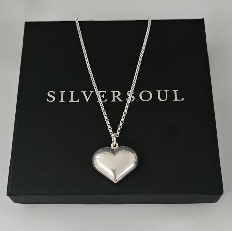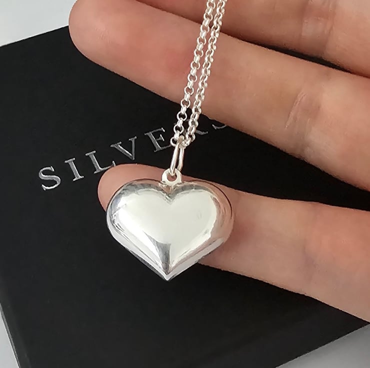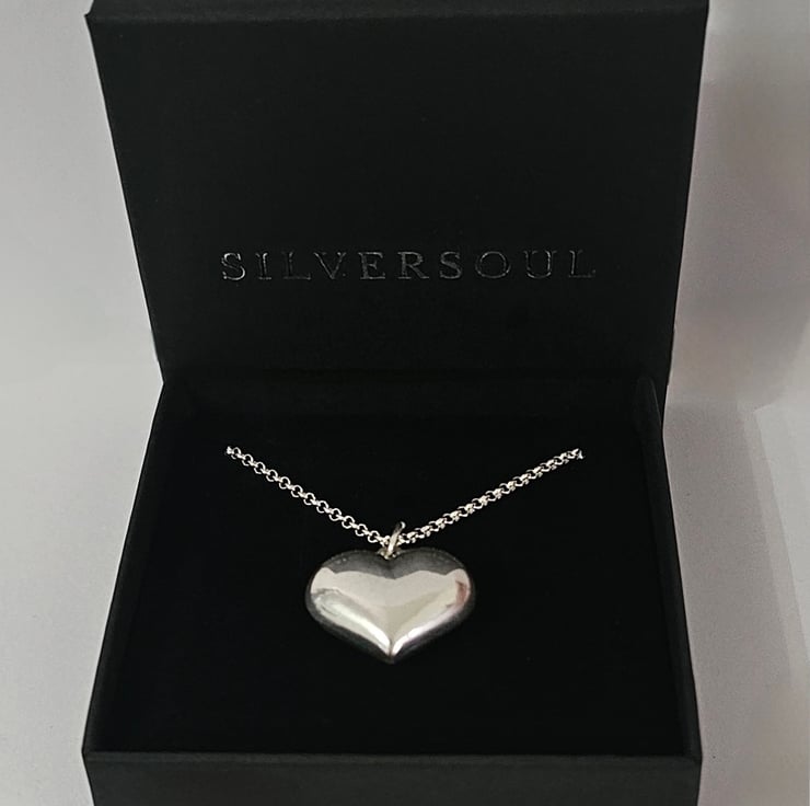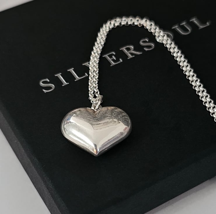 A perfect addition to any jewellery collection. A stunning large puff heart charm long Necklace that has style and beautifully designed and crafted with top quality Sterling silver.