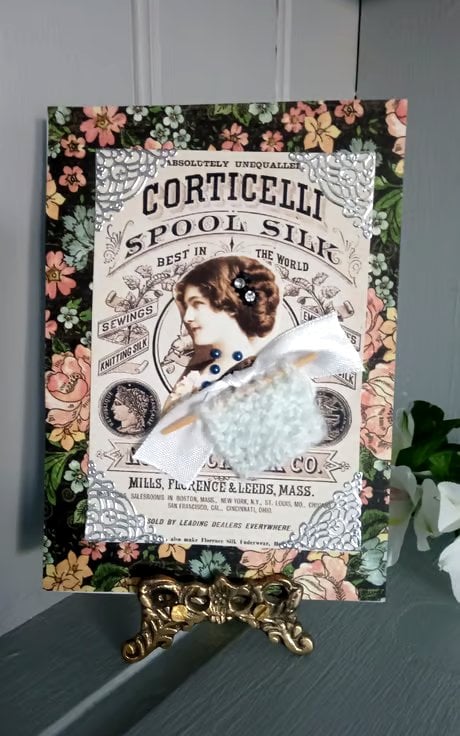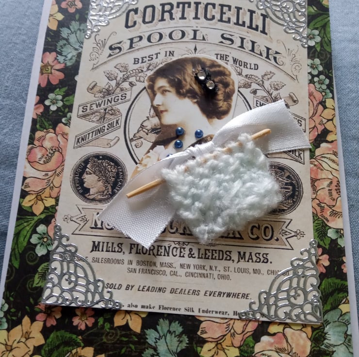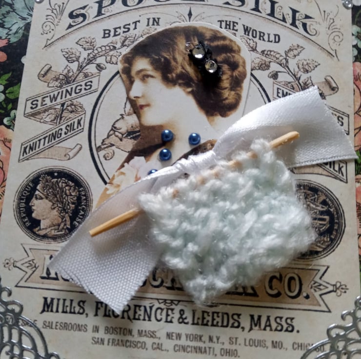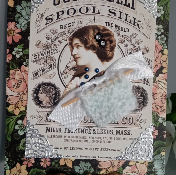 A very pretty and glamorous greeting card suitable for many occasions. The card is blank for your personal message. I have layered decorative papers and added a handmade knitted embellishment for a charming and unique card. The wool has a marble affect, with blue hints of colour throughout.