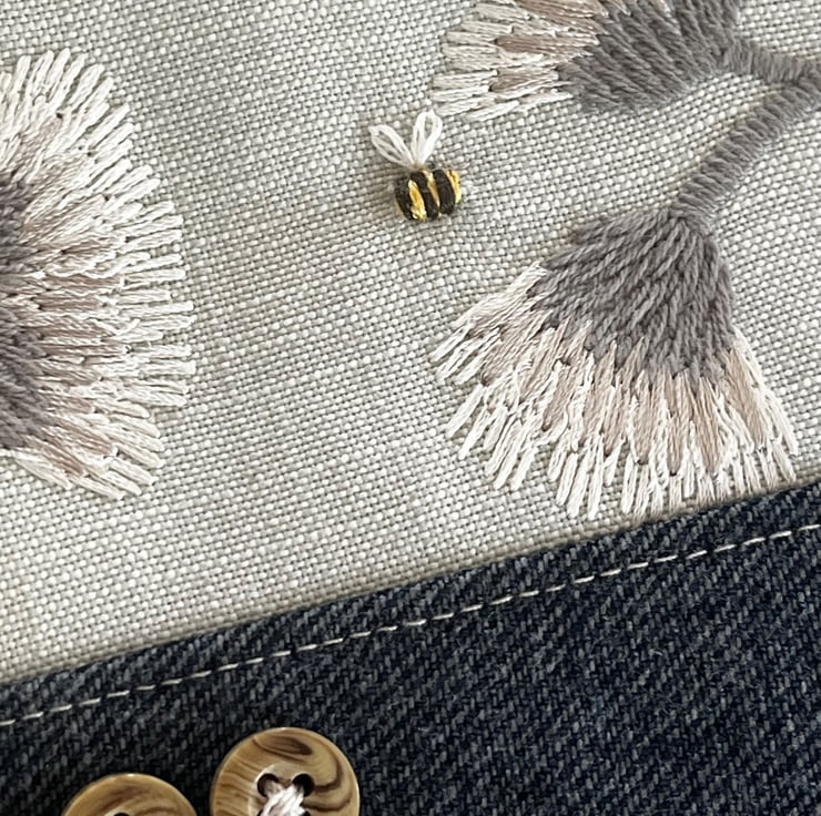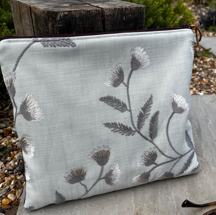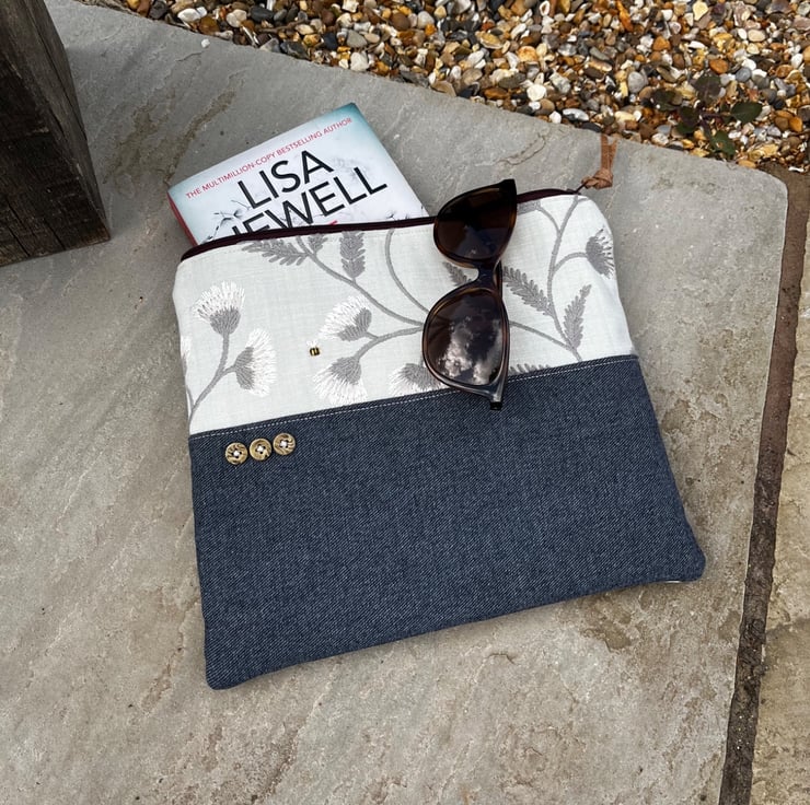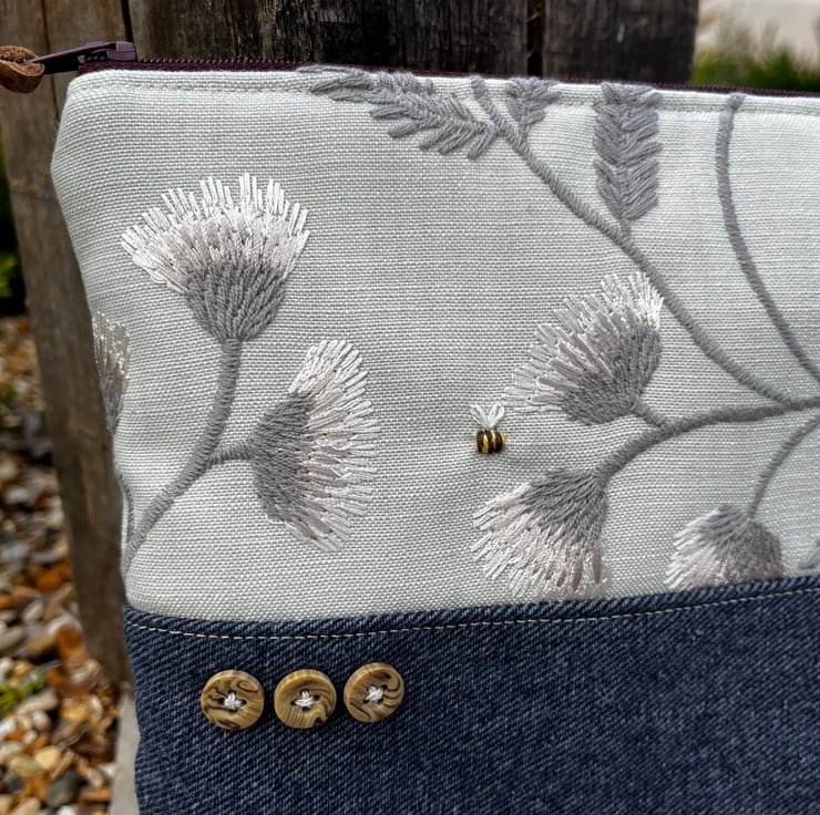 One of a kind soft zip pouch made from a pretty embroidered sample swatch and denim from the leg of a pair of jeans. There was a tiny mark on the embroidered fabric so I have embroidered a little bee over it.