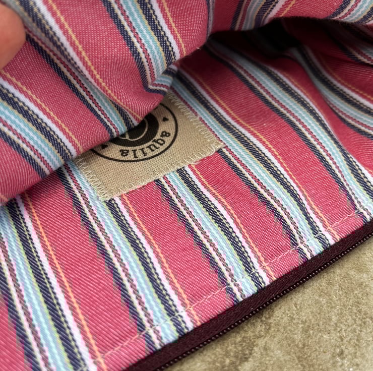 It is fully lined with cotton from a pink striped shirt. The pouch is a great size for a paperback book, purse and phone. It could also be used for small craft projects or cosmetics.