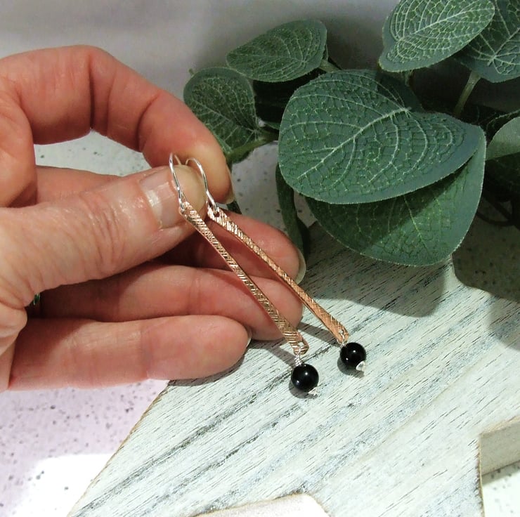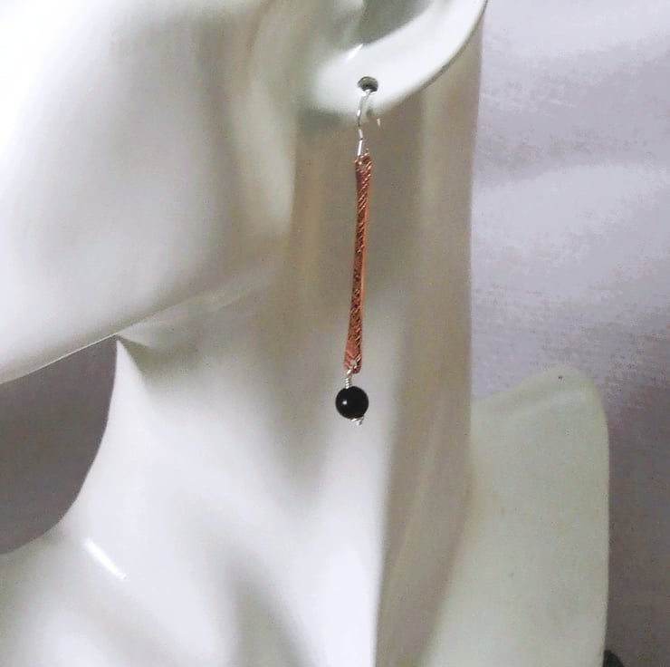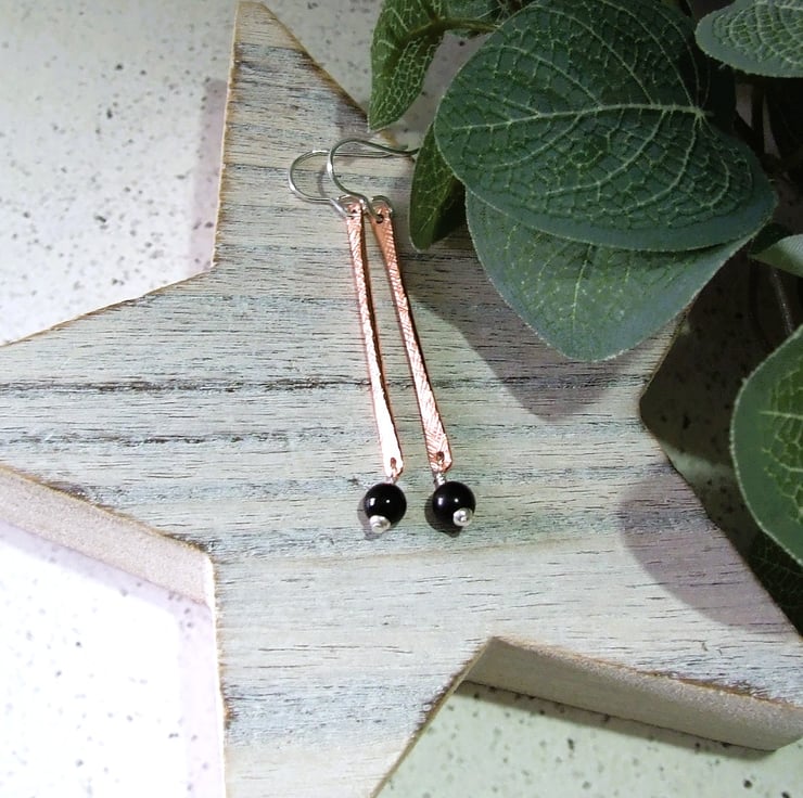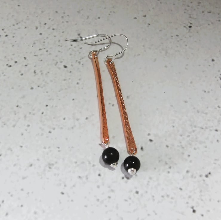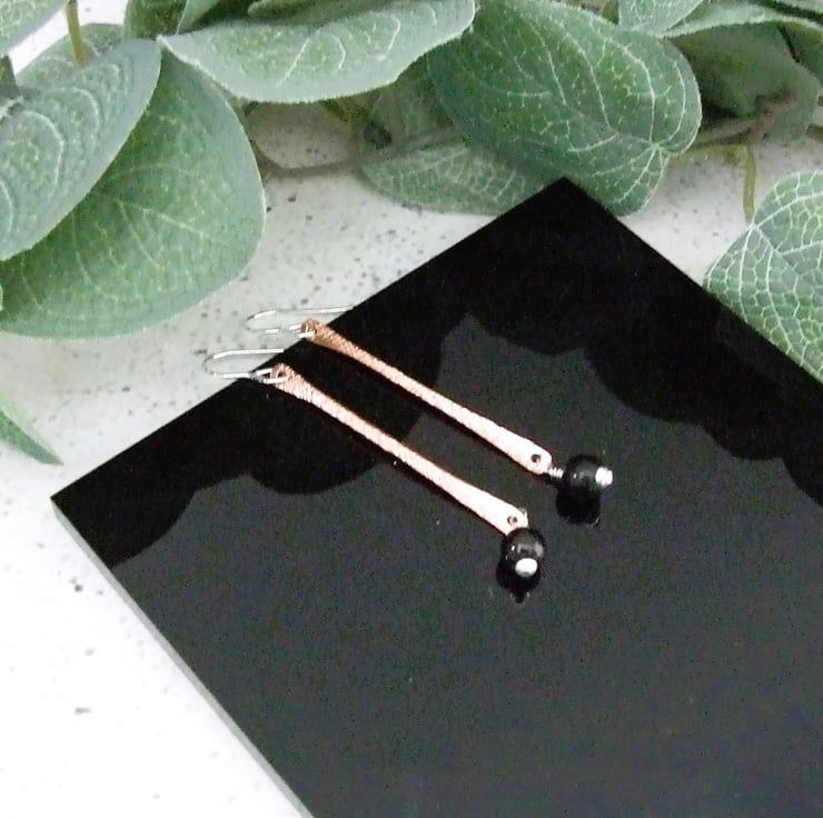 Copper bar dropper earrings with obsidian and sterling silver fittings and ear wires.