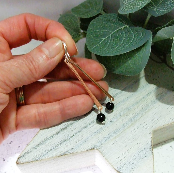 I have created the bar dropper shapes from copper wire and textured them with a hammer. To these I have added sterling silver ear wires and some 6mm black obsidian beads. All fittings are sterling silver.