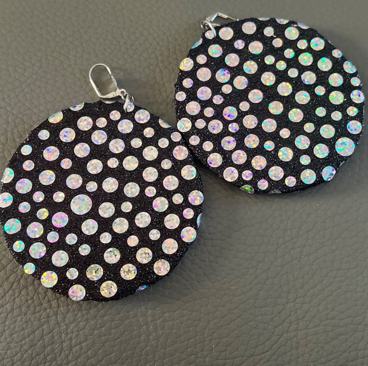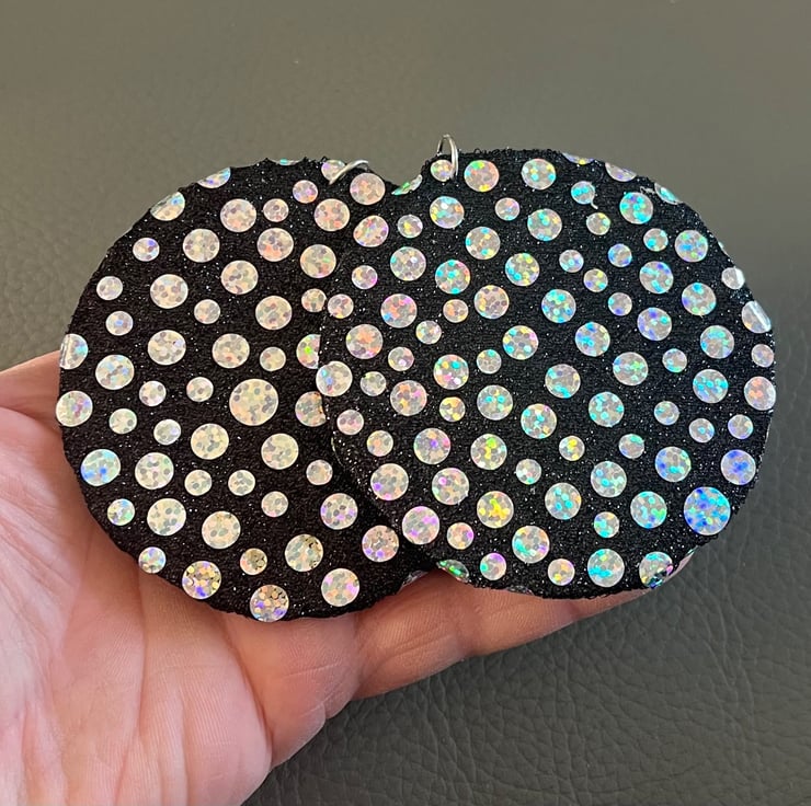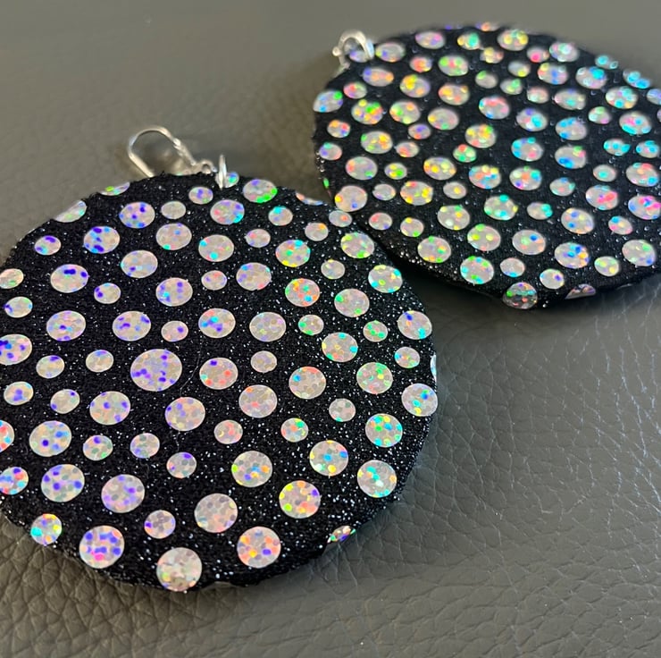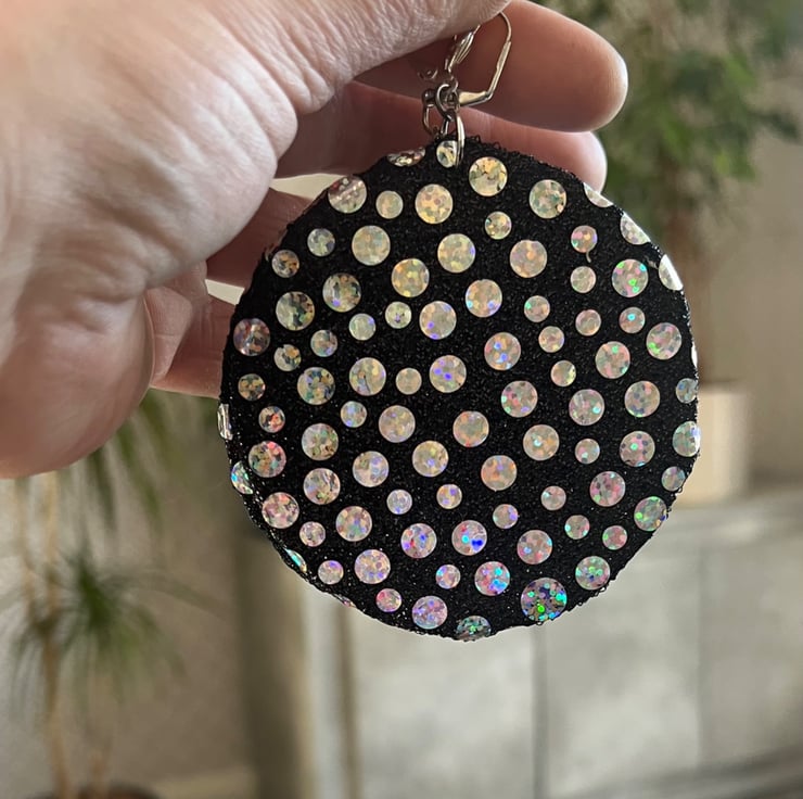 These bold round earrings are handcrafted from fabric and finished with a shimmering black glitter base, decorated with eye-catching iridescent polka dots that reflect light beautifully. The back side is finished with black natural leather. The playful yet elegant design makes them perfect for adding sparkle and personality to any outfit-whether for everyday wear or special occasions.