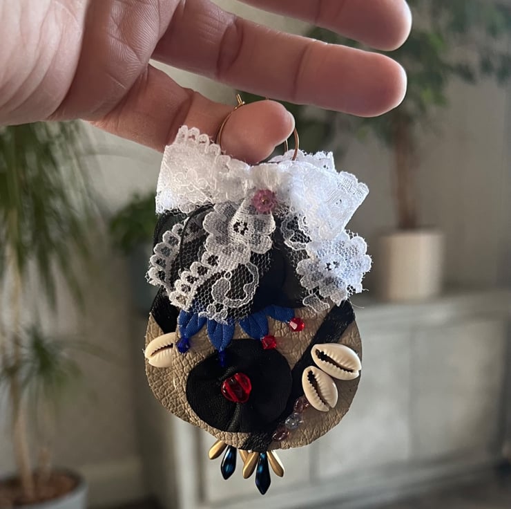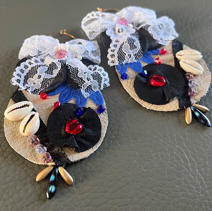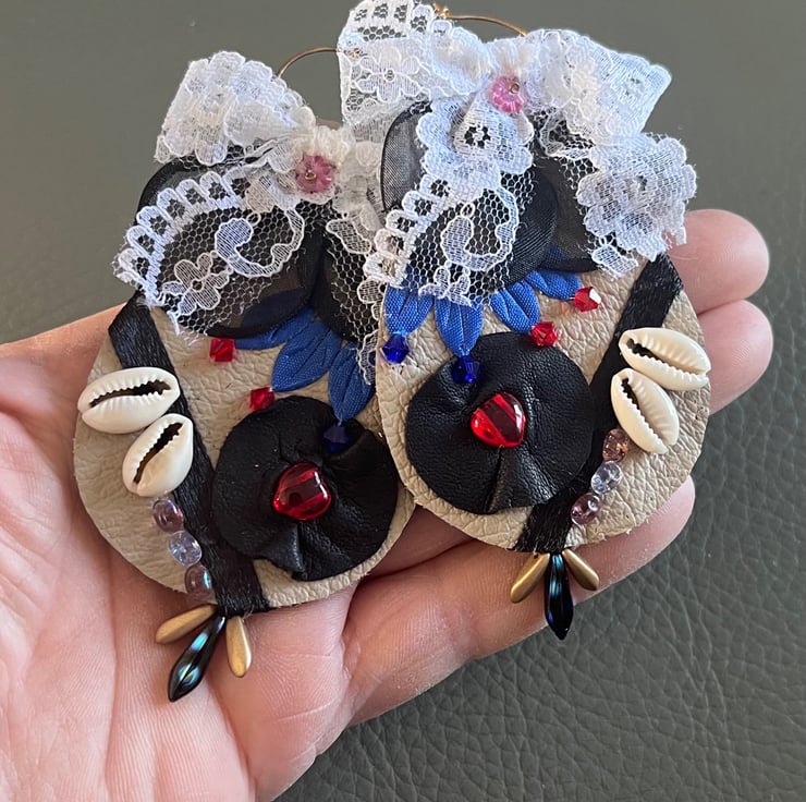 These one-of-a-kind statement earrings are handcrafted from natural leather and enriched with a mix of carefully selected materials and embellishments. Featuring delicate lace, decorative beads, shells, and textured leather elements, they create a bold, artistic composition with a boho-inspired feel.