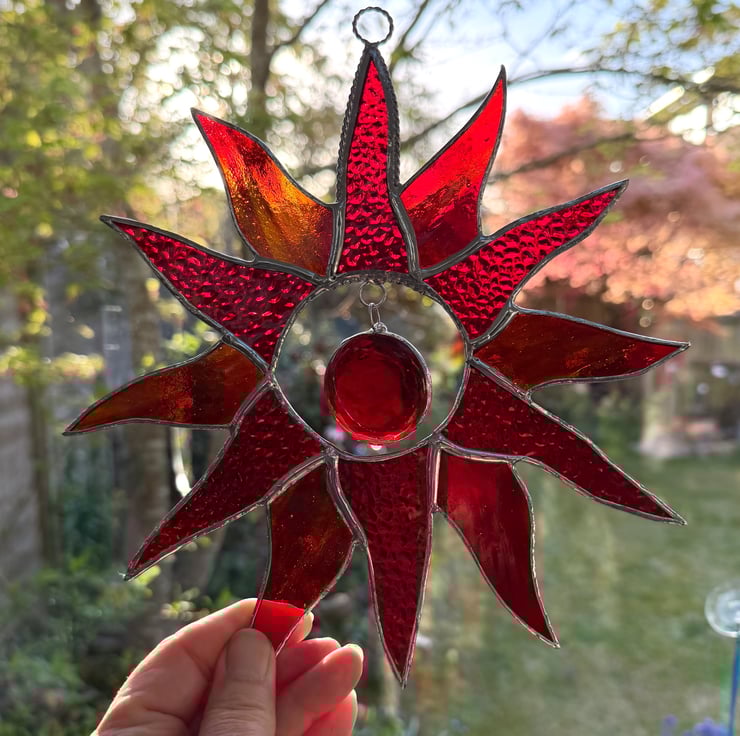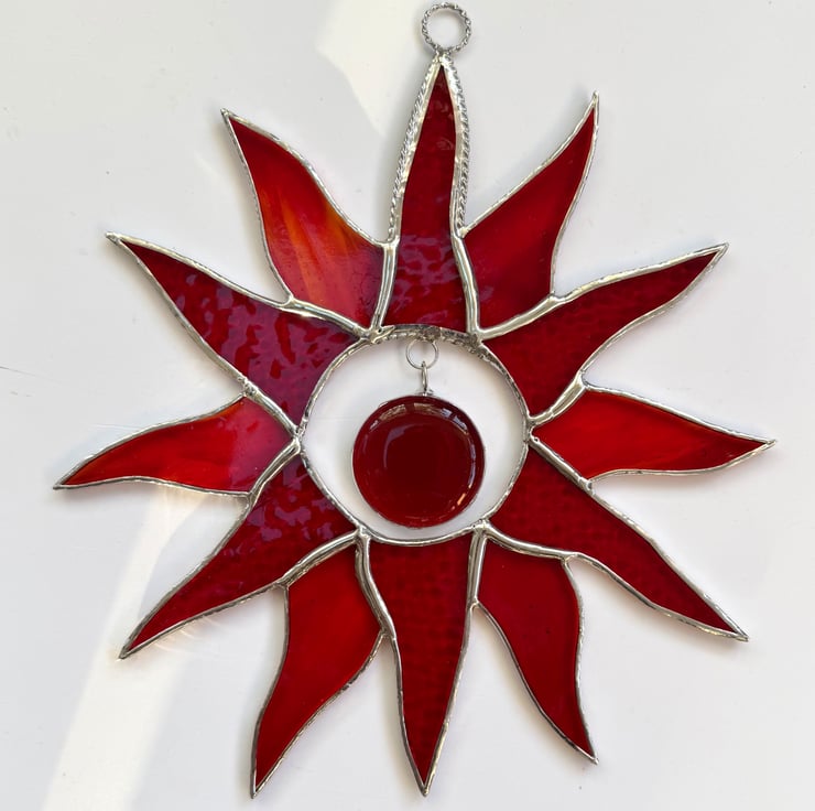 This suncatcher has ben made using 2 types of red stains glass with a large red glass nugget in the centre.