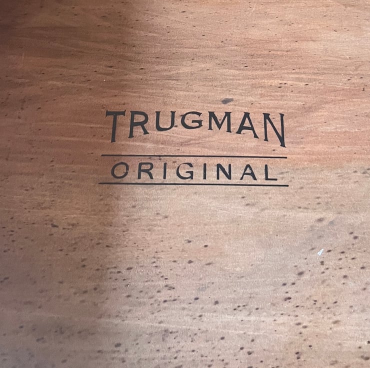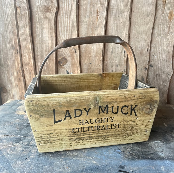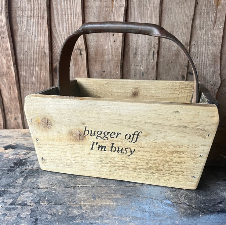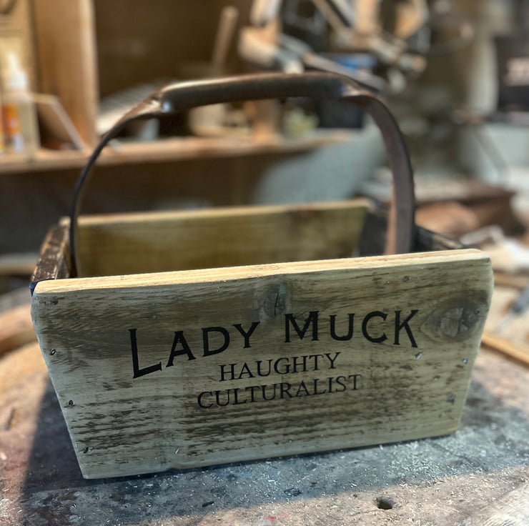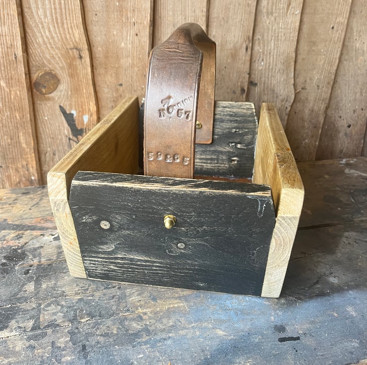 Discarded wood, the base was the bottom of a set of drawers last week, old leather handle with a rich deep patina and signs of action with the Royal Navy circa 1917. Brass fittings and a charming Yorkshire greeting on the back.