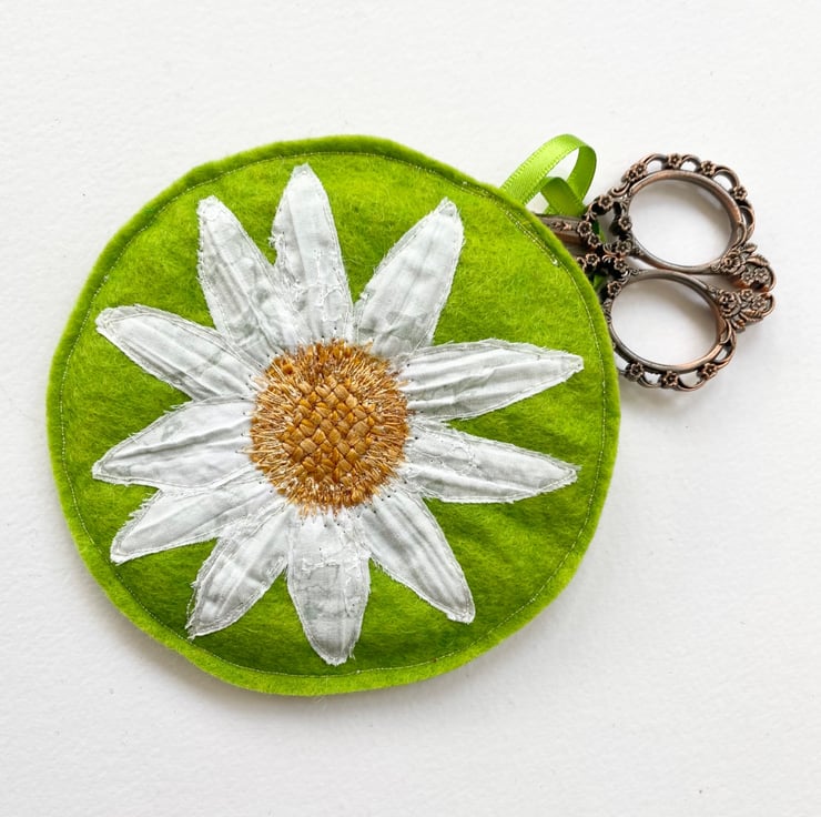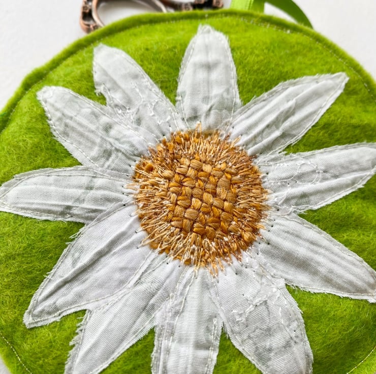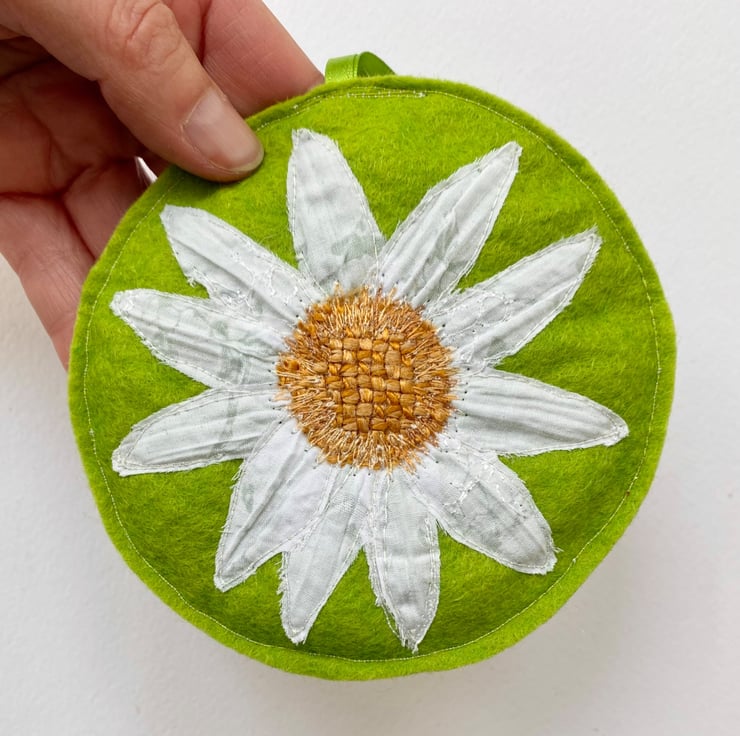 This summery daisy embroidered home decoration or ornament has been made from up-cycled fabrics and stitched down with free motion embroidery. It comes felt backed and measure approx 12cm, with the ribbon the length is 21cm.