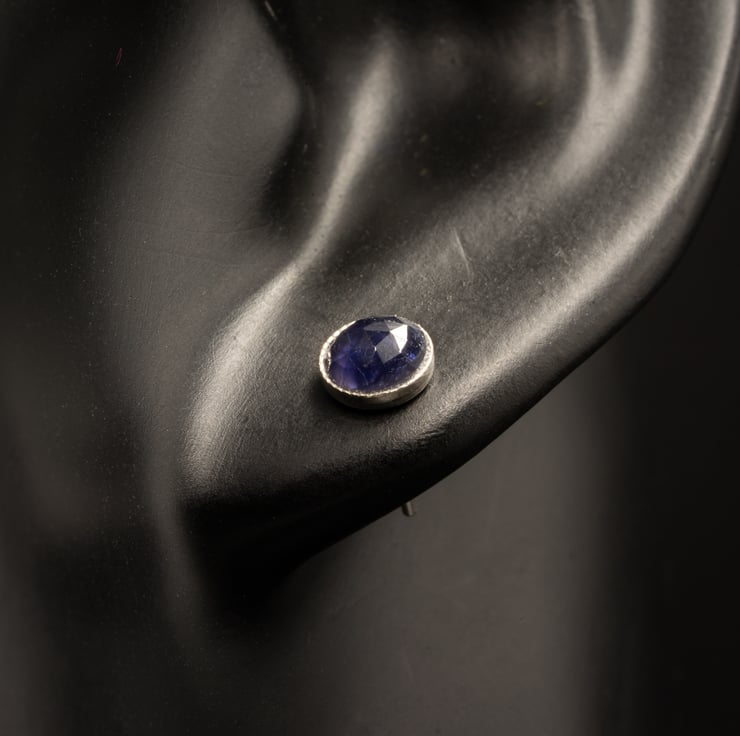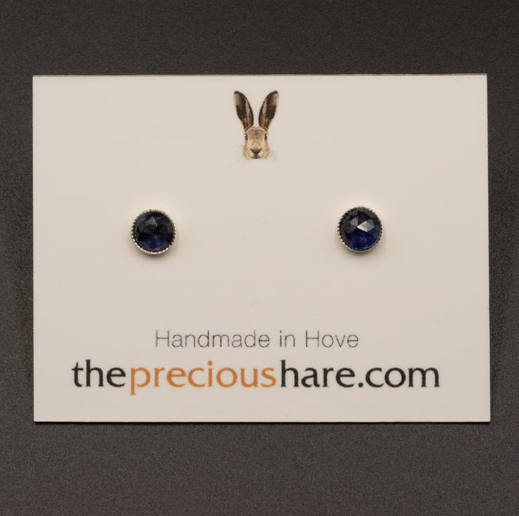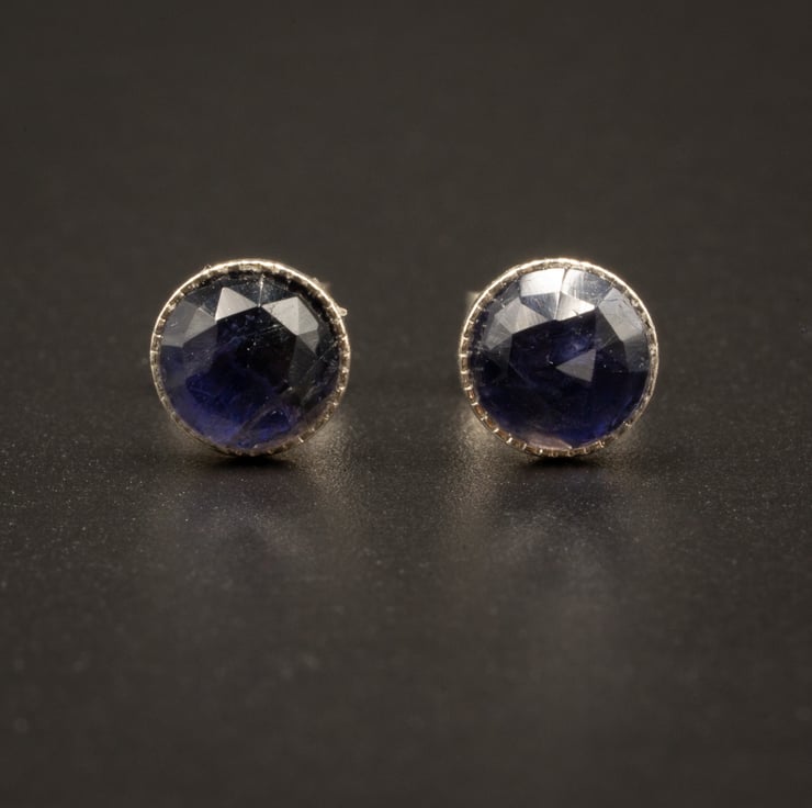 Tiny inky blue 5mm faceted iolite cabochon stones are mounted into a solid sterling silver mill edged mount with a butterfly clip to secure. Very pretty inky blue fine quality cut stones.