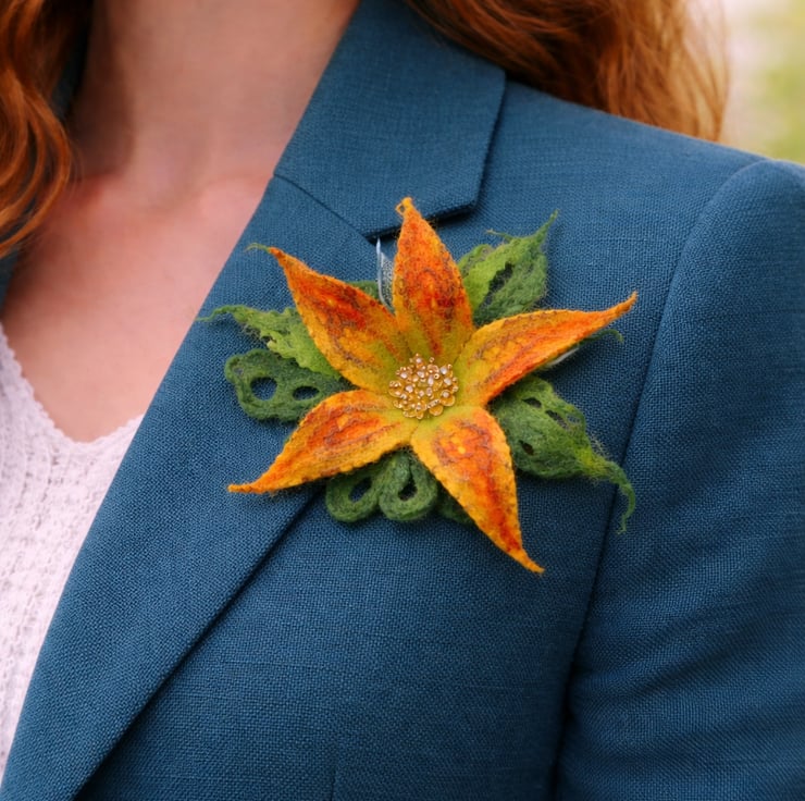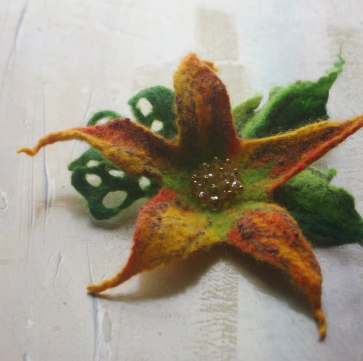 Handmade felted wool brooch in the shape of an artistic flower. Created using the wet felting technique, this piece features rich autumn-inspired tones of orange, green, and earthy shades. The brooch is decorated with textured wool details and delicate bead accents in the center, adding depth and a natural organic look.
