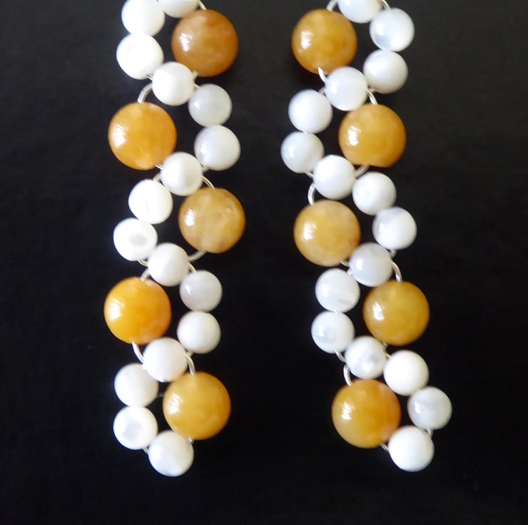 Inspired by the theme of Daisy Chains, I wanted to make something a little different. I used yellow Calcite beads for the centres and Mother of Pearl for the petals, strung on sterling silver wire.