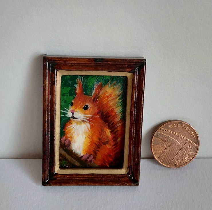An original oil painting of a happy bright eyed squirrel. Painted by me using oil paints on my handmade art board, varnished and in a wooden frame.