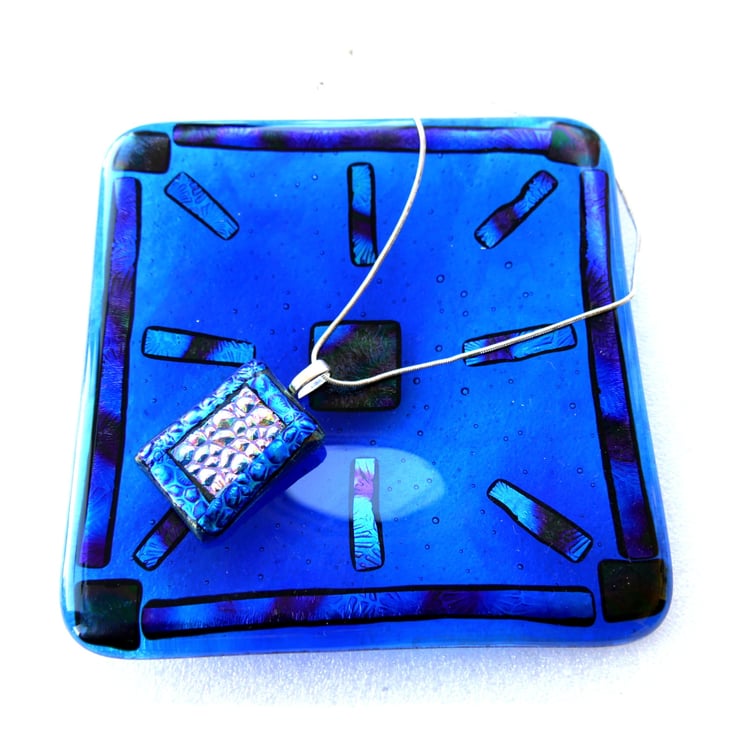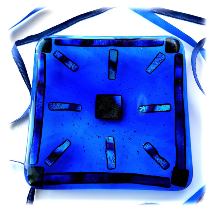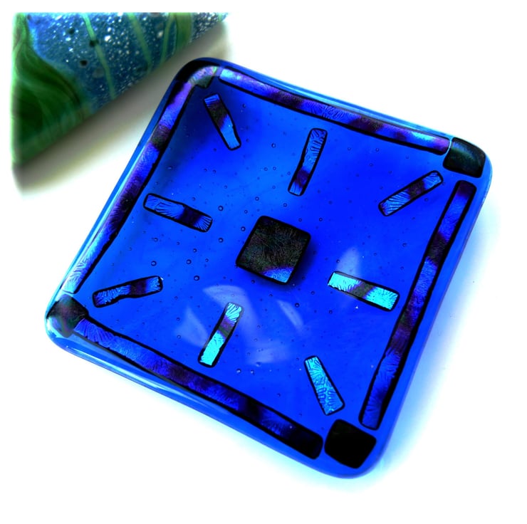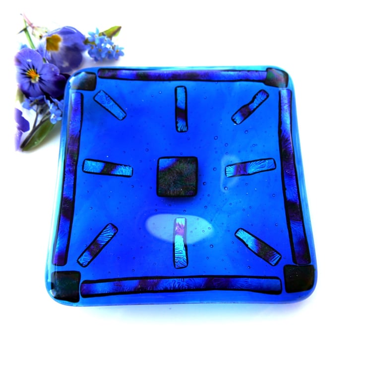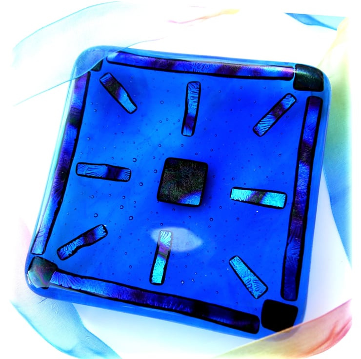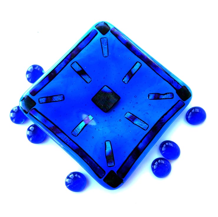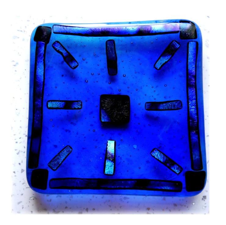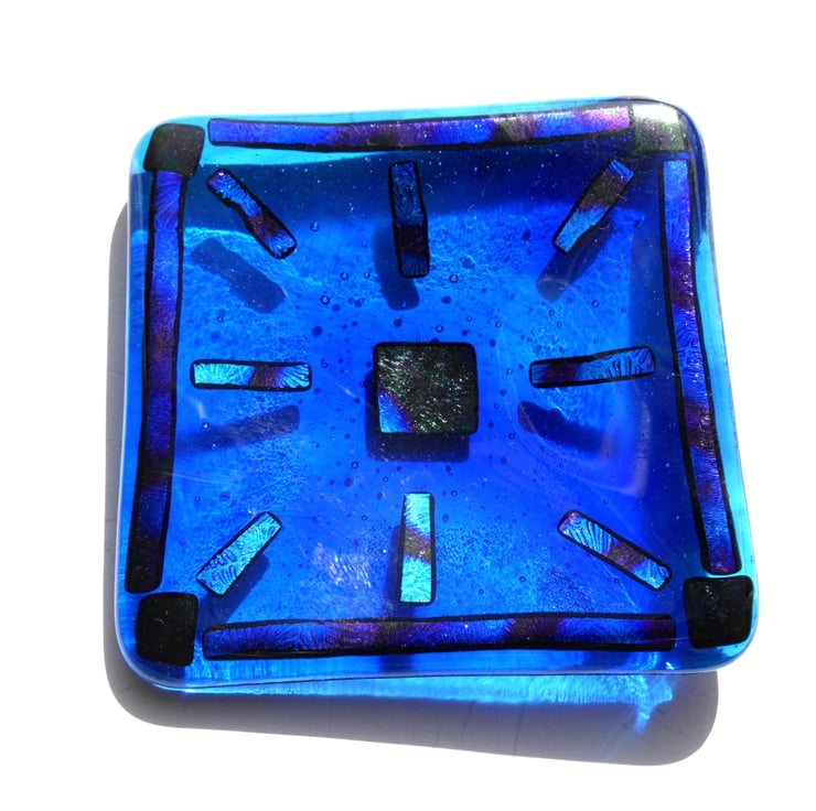 A 12cm square dish which I fused in my kiln. Twice, once to fuse all the glass together into a flat square and then again, to slump it into the shallow dish shape.