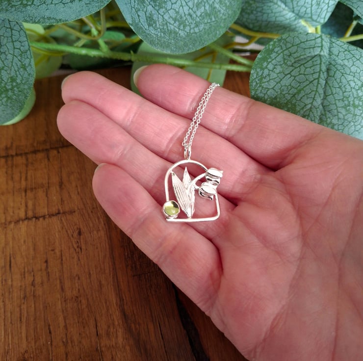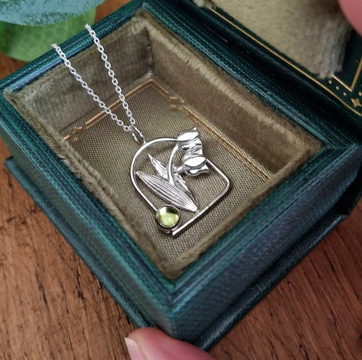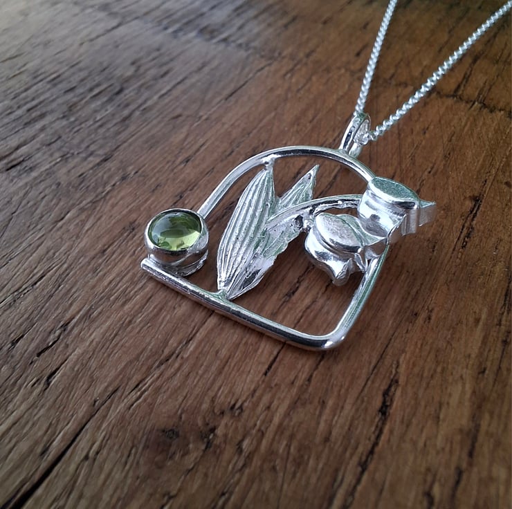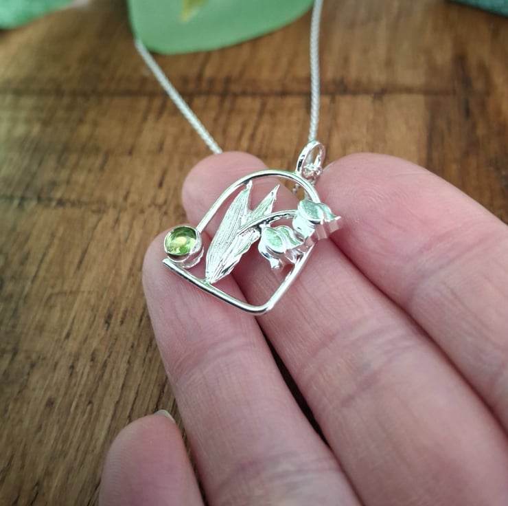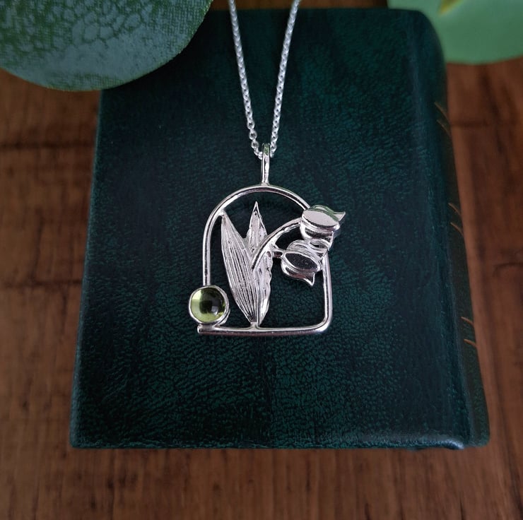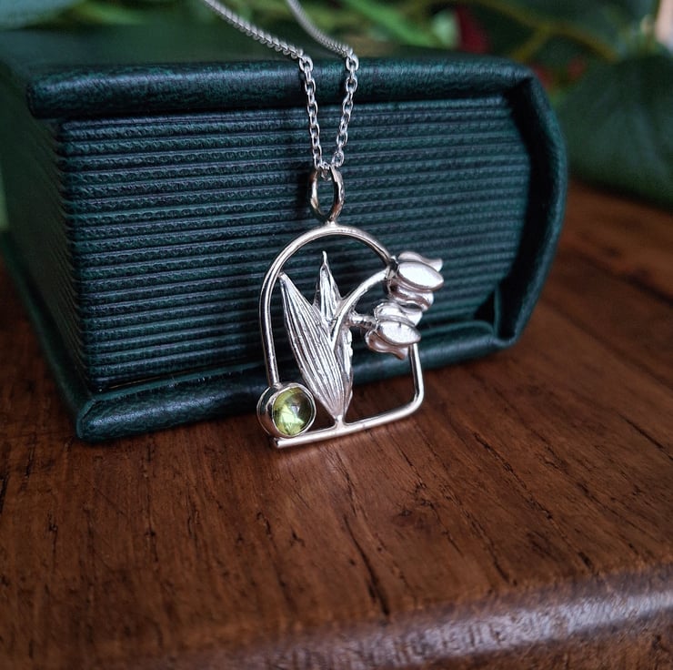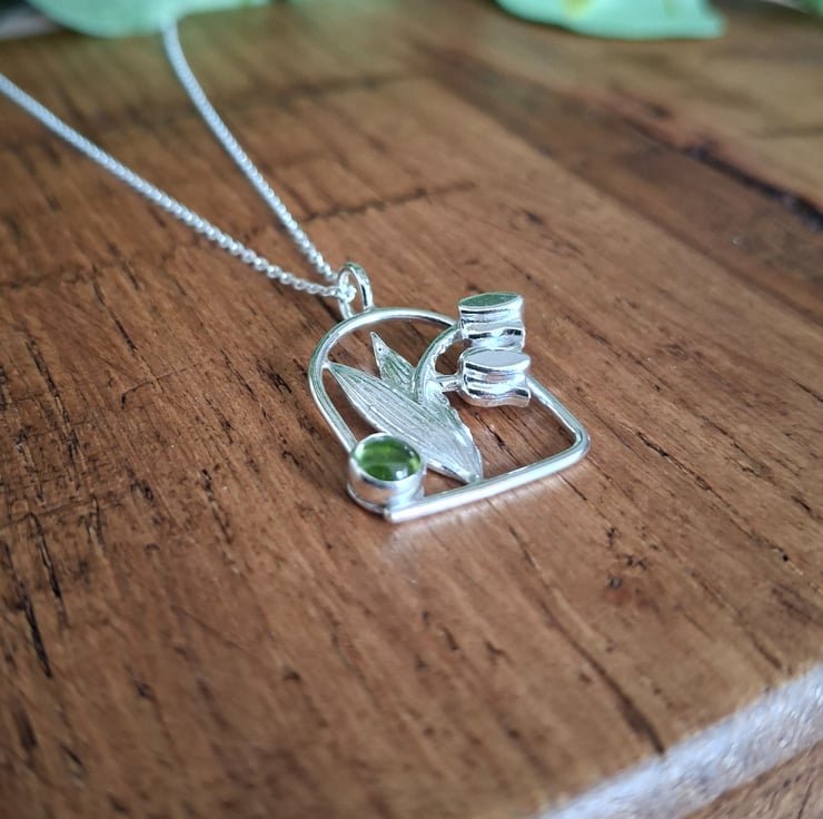 The arch pendant is a little less than 1inch big and made with Fine Silver (99.9% silver) as well as Sterling Silver, the 20" long chain is made with Sterling Silver, the fresh green Peridot is 5mm big.