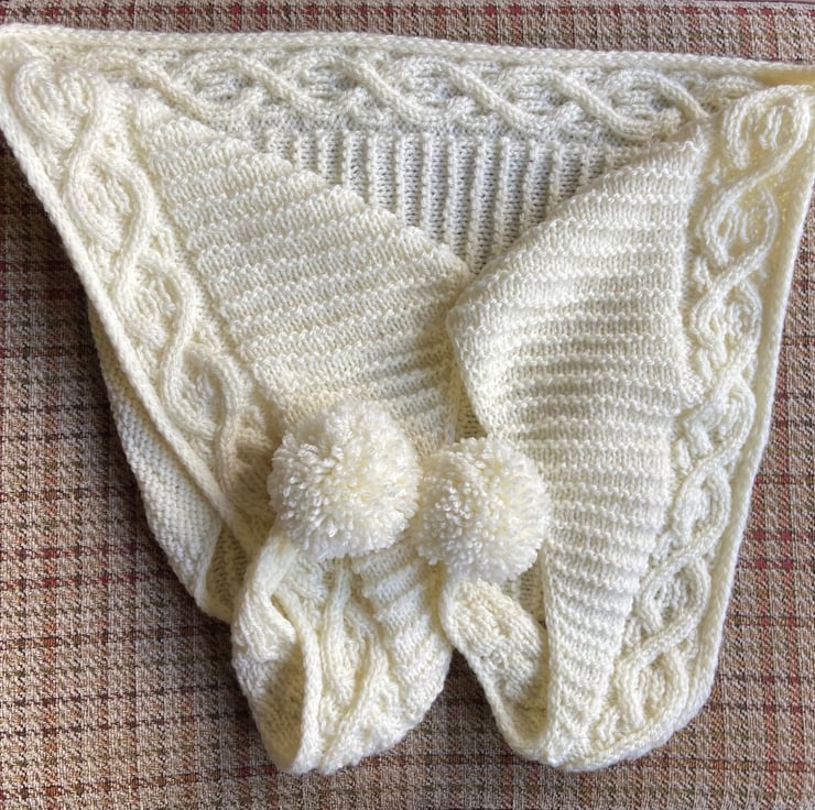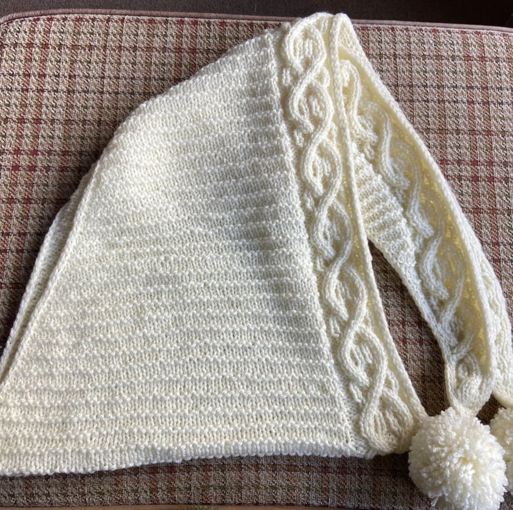 A beautiful hand knit cable based wrap with hand wrapped Pom poms.