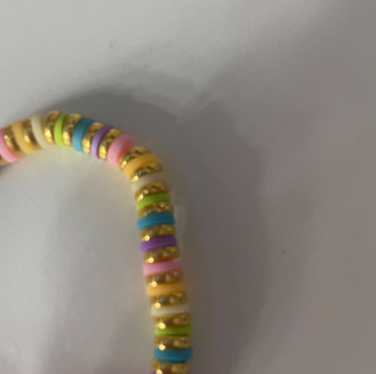 This cute bracelet has a pastel rainbow of colour with golden spacer beads bordering each clay bead. It can be bought for many uses like a bday gift or even for yourself as an addition to any outfit!!