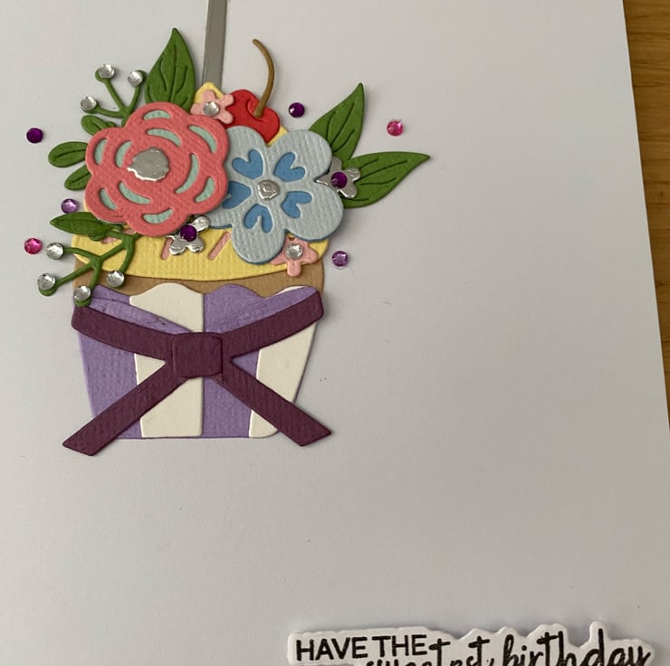 Celebrate their special day with this cheerful handmade birthday card, featuring a beautifully layered floral cupcake topped with a glowing candle. Completed with a purple bow and a handstamped sentiment "Have the sweetest birthday."