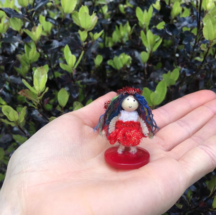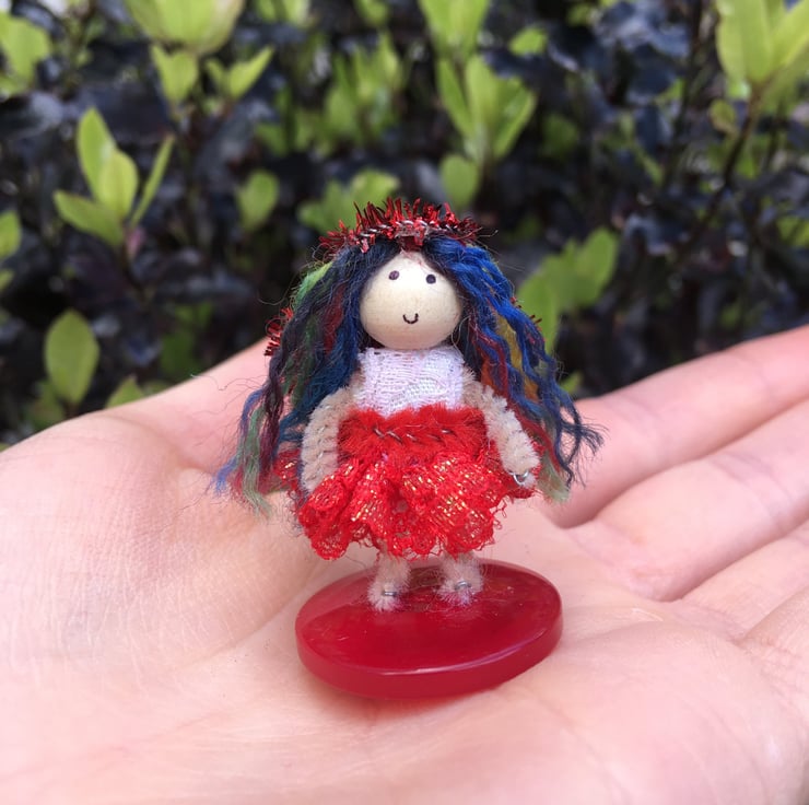 She has a pipe cleaner body, wooden bead head with carefully hand draw features, a lace dress and rainbow wool hair.