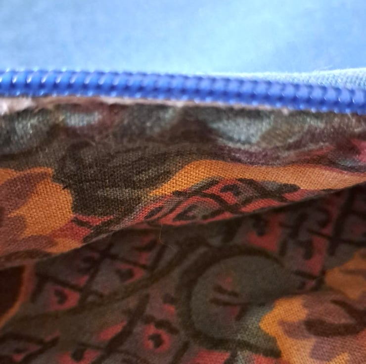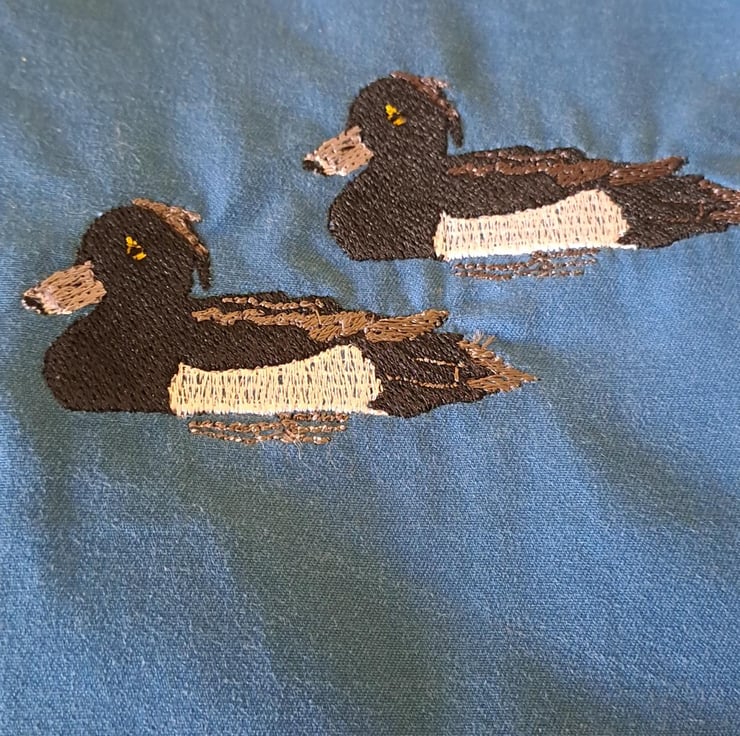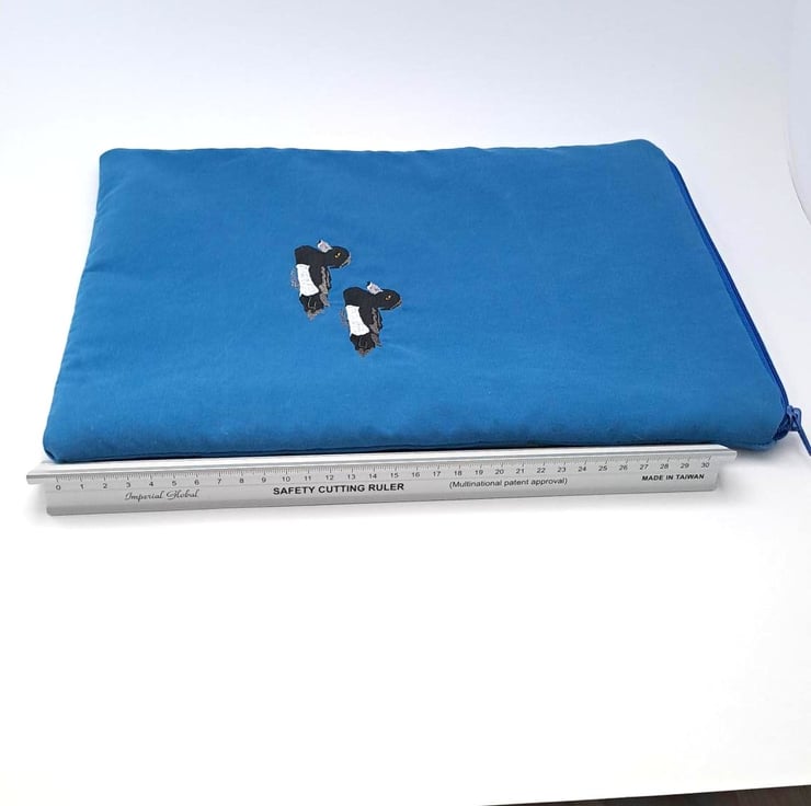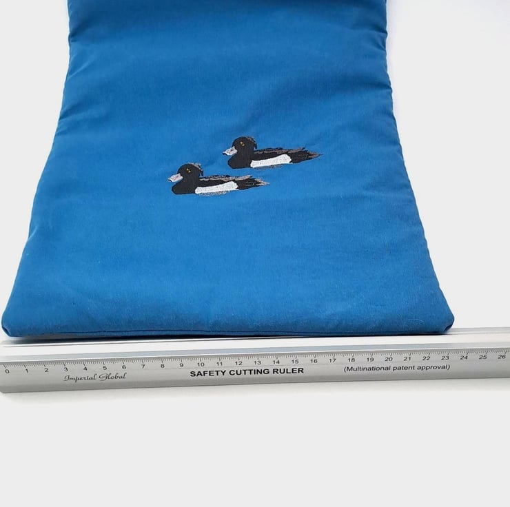A blue padded cotton pouch with zip top. 25cm x 35cm. Lined with patterned cotton. Depicting 2 tufted ducks.
