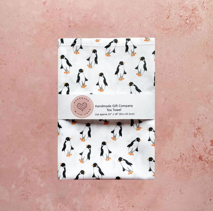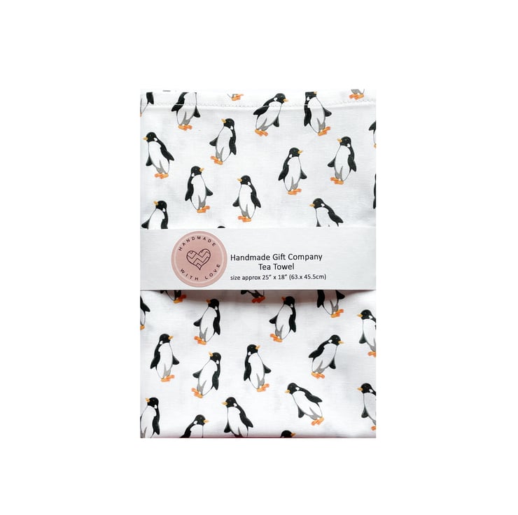 Lovely Handmade Cotton Tea Towel - Penguins Design in White. This is one of our own designs and is not available to purchase in any other store. Unique to Handmade Gift Company.