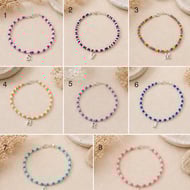 Add a pop of vibrant colour to your summer style with this beautiful handmade anklet! Crafted with delicate 3mm white Czech glass seed beads and striking fuschia dyed shell chip beads, this piece is finished with a charming pearl shell pendant for an elegant beachy touch.