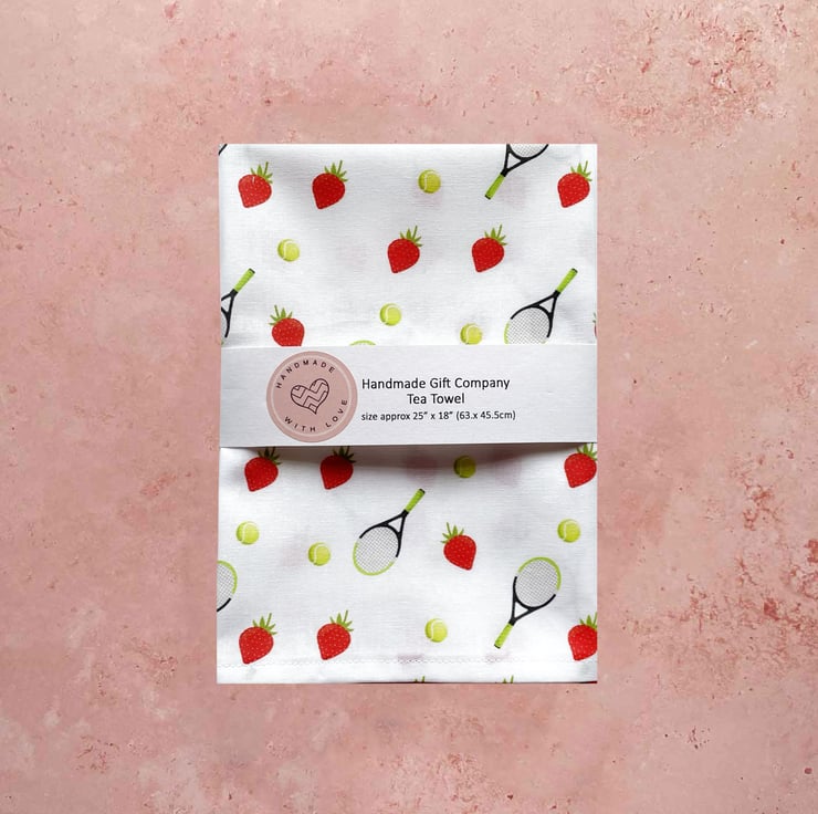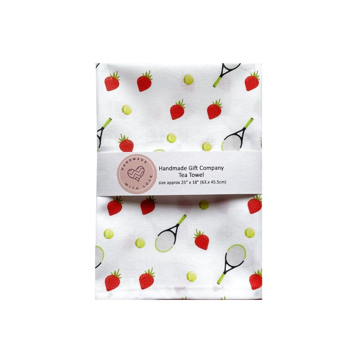 Lovely Handmade Cotton Tea Towel - Tennis Design. This is one of our own designs and is not available to purchase in any other store. Unique to Handmade Gift Company.