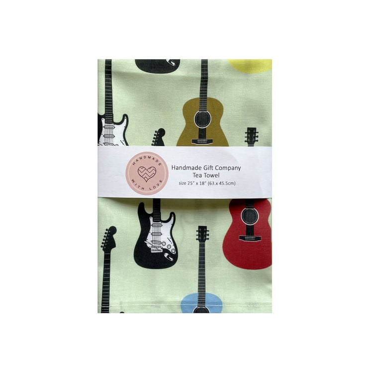 Lovely Handmade Cotton Tea Towel Coloured Guitars. This is one of our own designs and is not available to purchase in any other store. Unique to Handmade Gift Company.