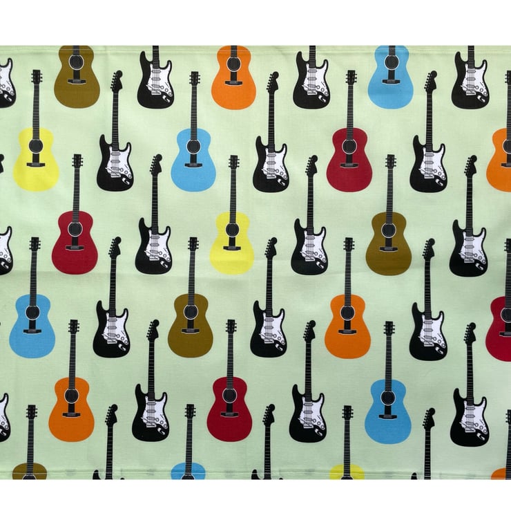 Handmade tea towel with lovely Multicoloured Guitar design on a cotton pale green fabric