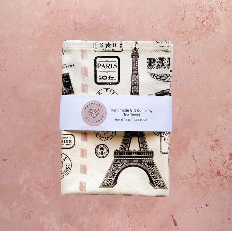 Lovely Handmade Cotton Tea Towel Paris Design. This is one of our own designs and is not available to purchase in any other store. Unique to Handmade Gift Company.