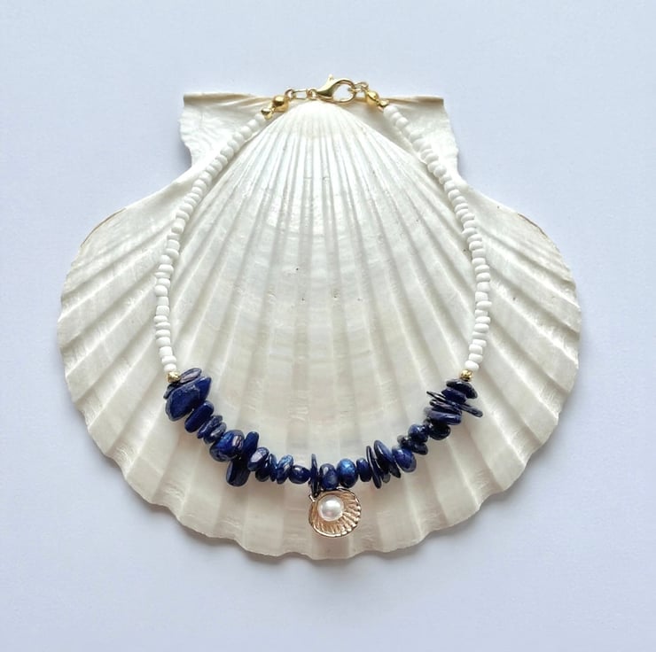 Materials: Deep Dark Blue dyed shell chip beads paired with White Czech glass seed beads for a high quality, artisan look.