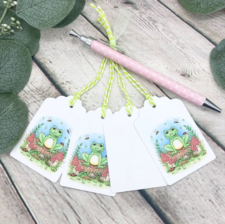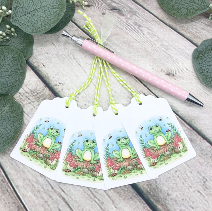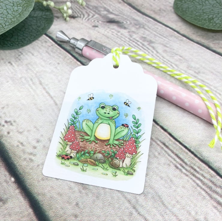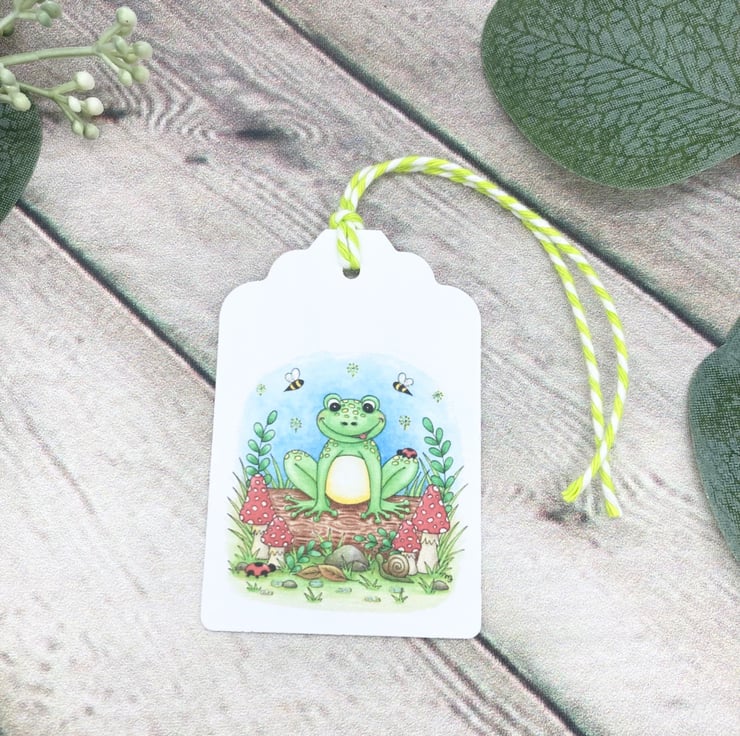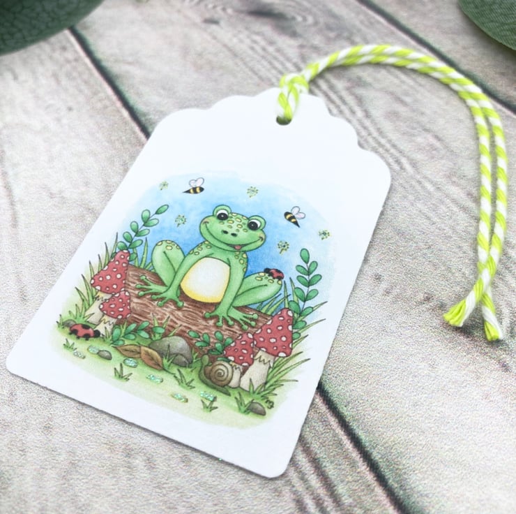 These cute frog on a log gift tags have been designed using my own original watercolour illustration. I have designed them to match and compliment my handmade cards in the same design.