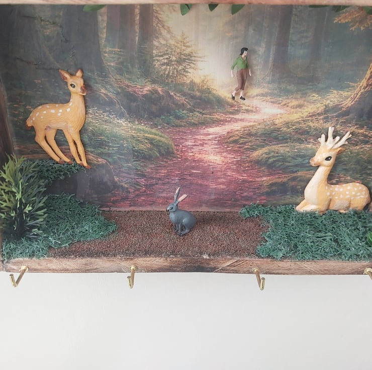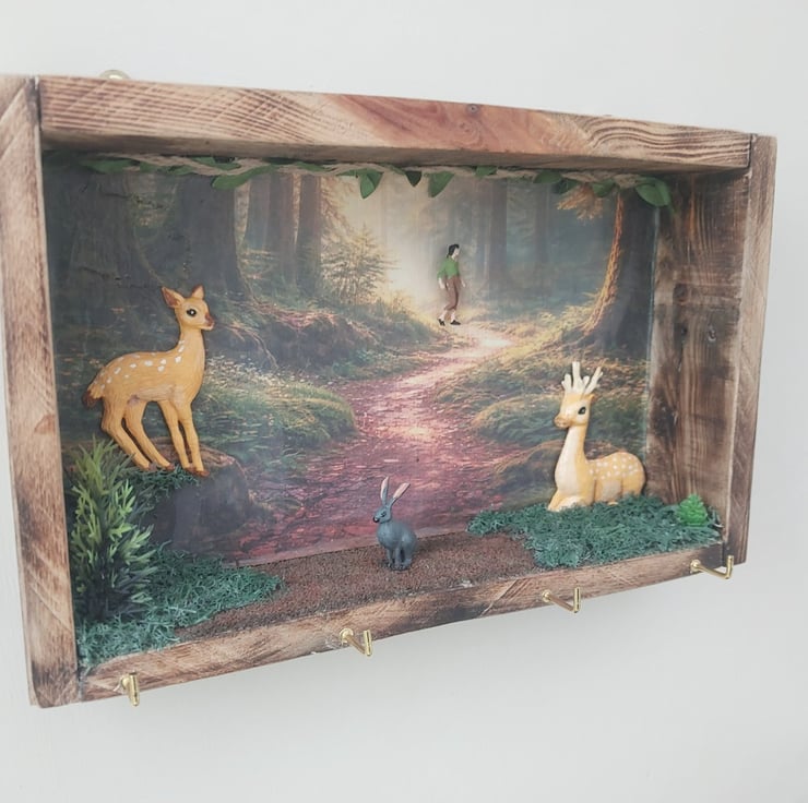 Bring a touch of nature indoors with this charming rustic shadow box key holder. Set within a natural wood frame, this handcrafted-style piece features a serene forest path backdrop, complete with clay miniature deer, walker and a rabbit for a peaceful woodland scene. Subtle greenery accents add depth and texture, creating a cozy, storybook feel.