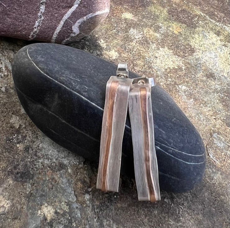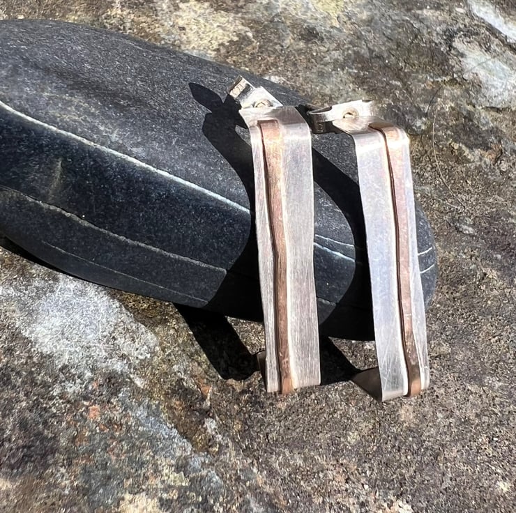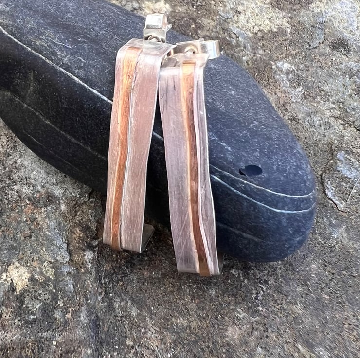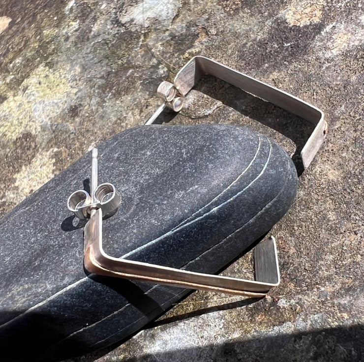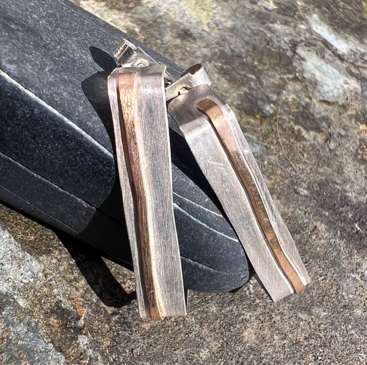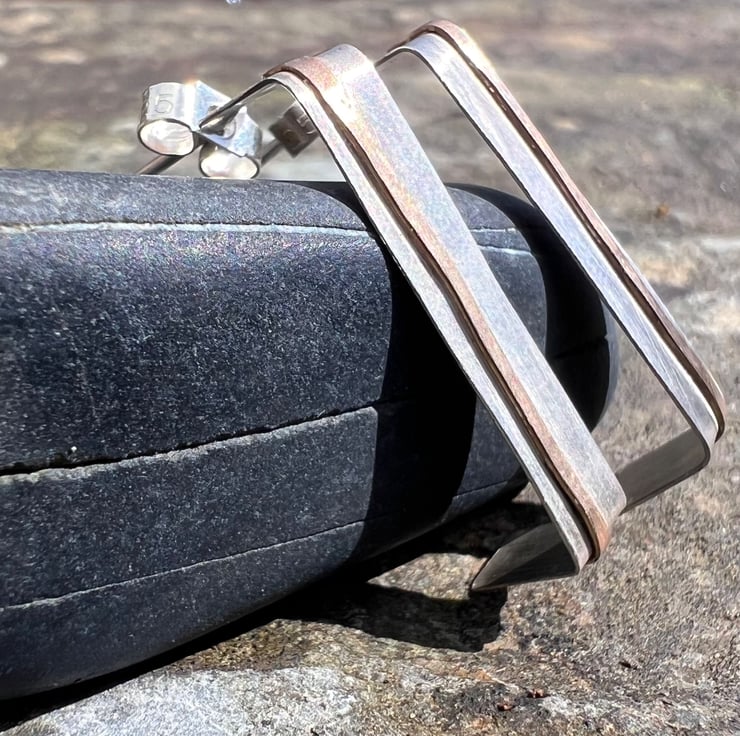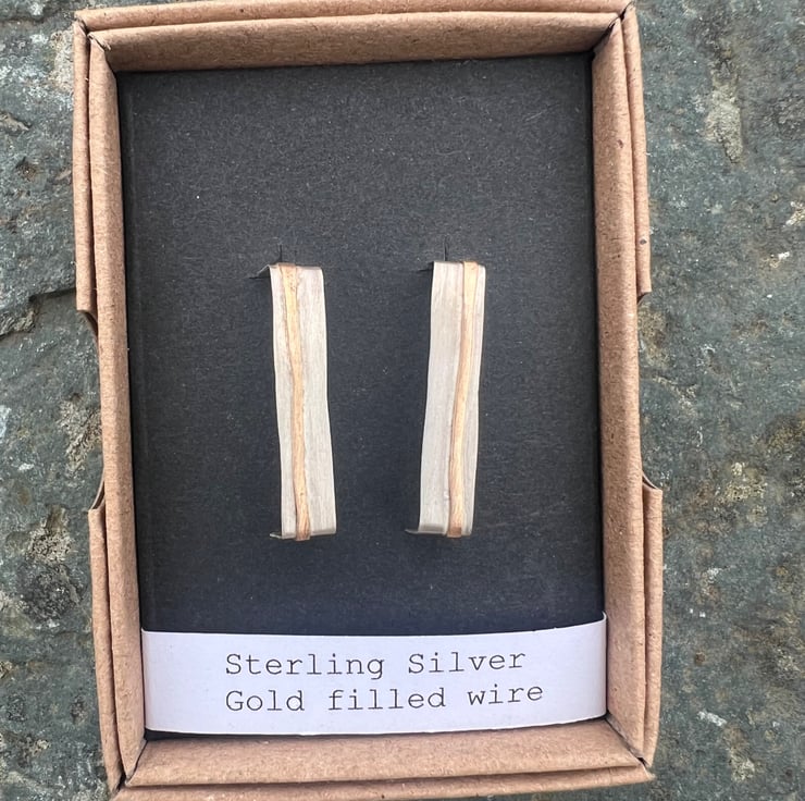 Sterling silver stud earrings in a rectangular shape -a quirky alternative to circular hoops . There is a stripe of gold , made with hammered gold filled wire , going through the middle, inspired by coastal cliffs.