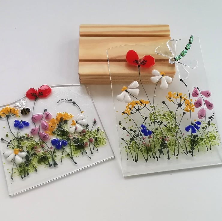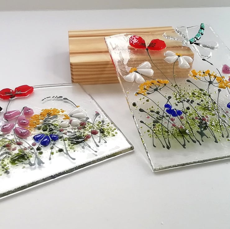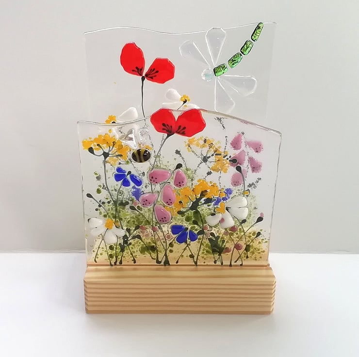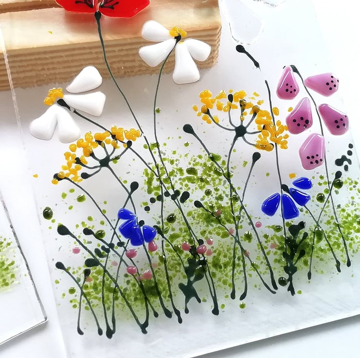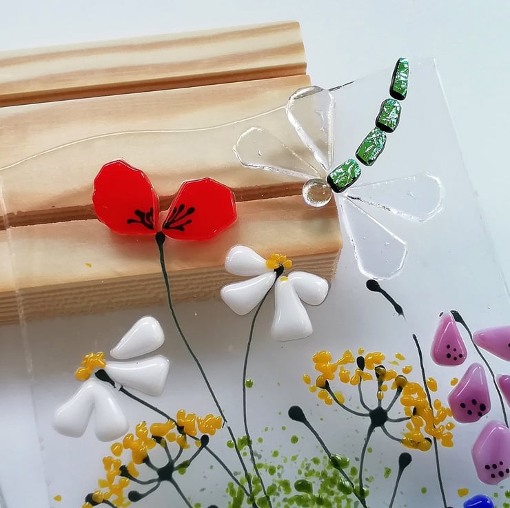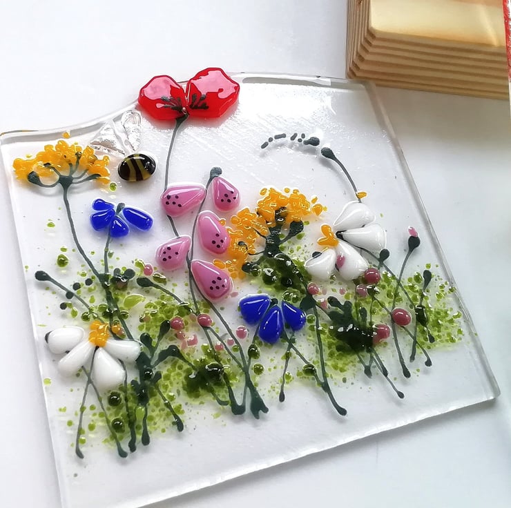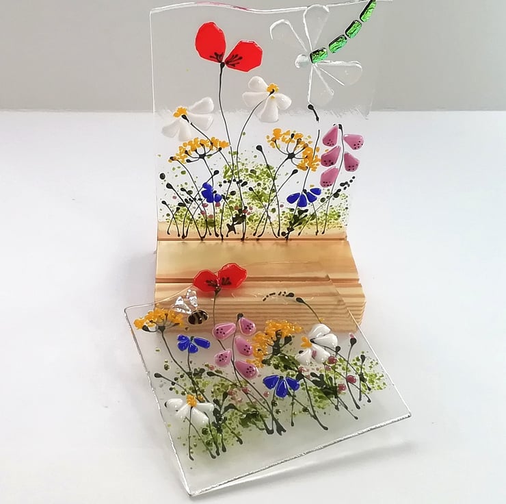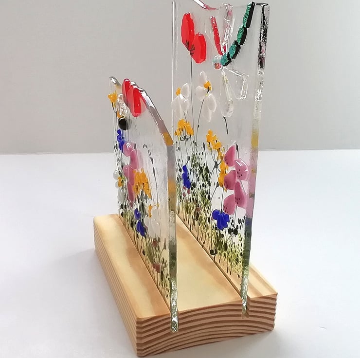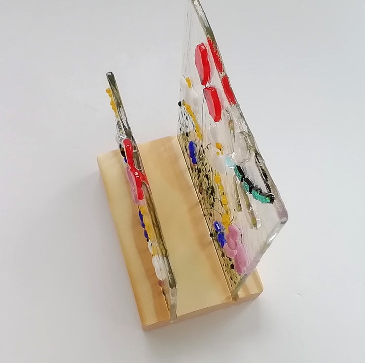 A beautiful layered piece that looks stunning on a windowsill or shelf. I hand cut my glass, each petal is nipped into shape by hand. I've used crushed glass and enamels. Once I'm happy with my design it goes into the kiln at a temperature of 755° to retain lots of definition. It slots snugly into a double slotted stand.
