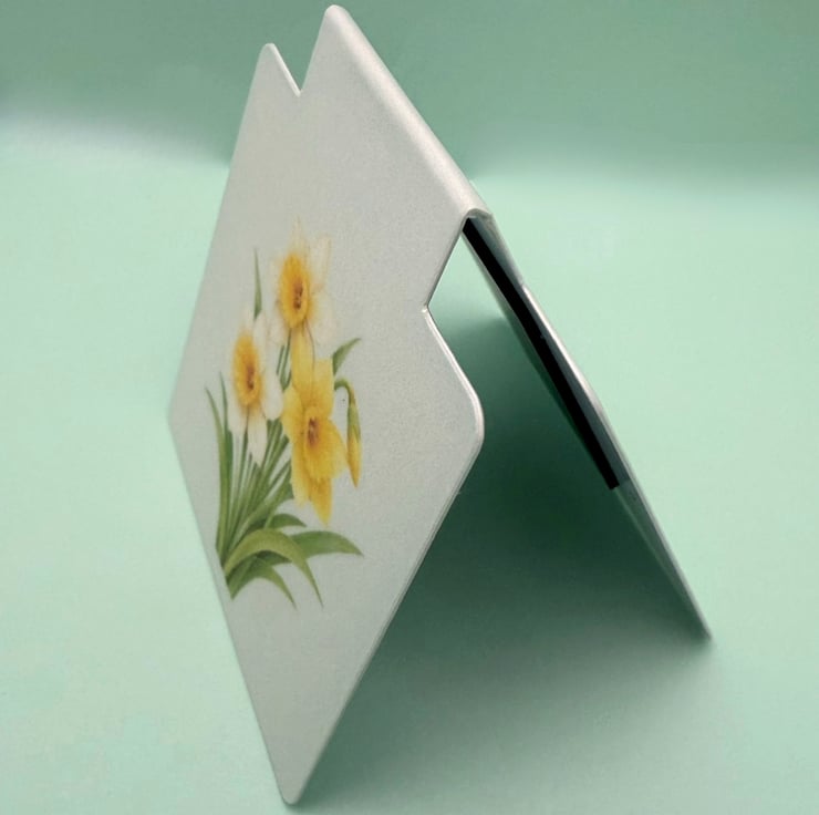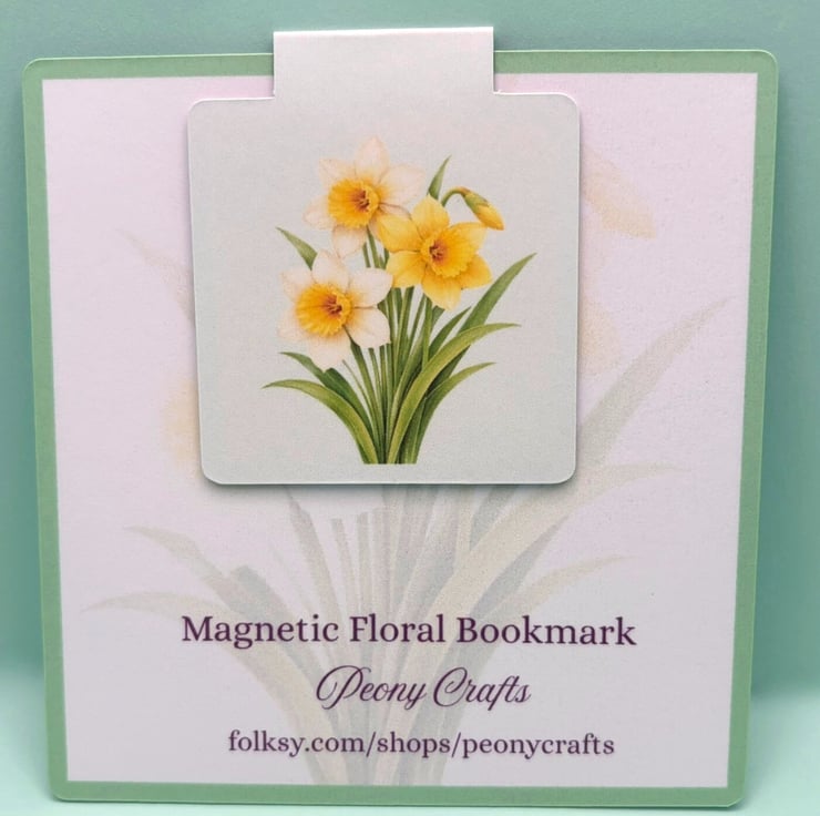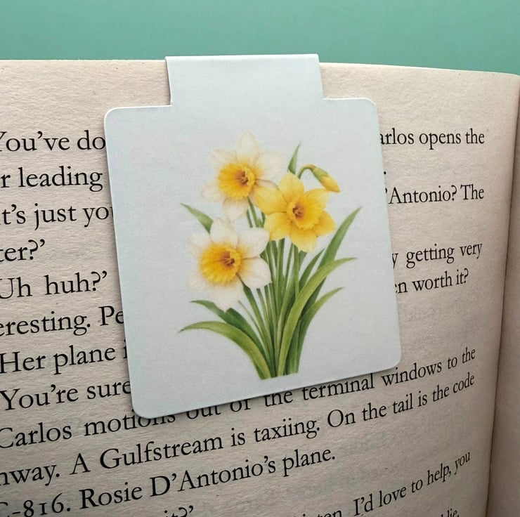 A delicate magnetic bookmark featuring a soft botanical illustration of the daffodil, designed to gently clip over your page without slipping.
